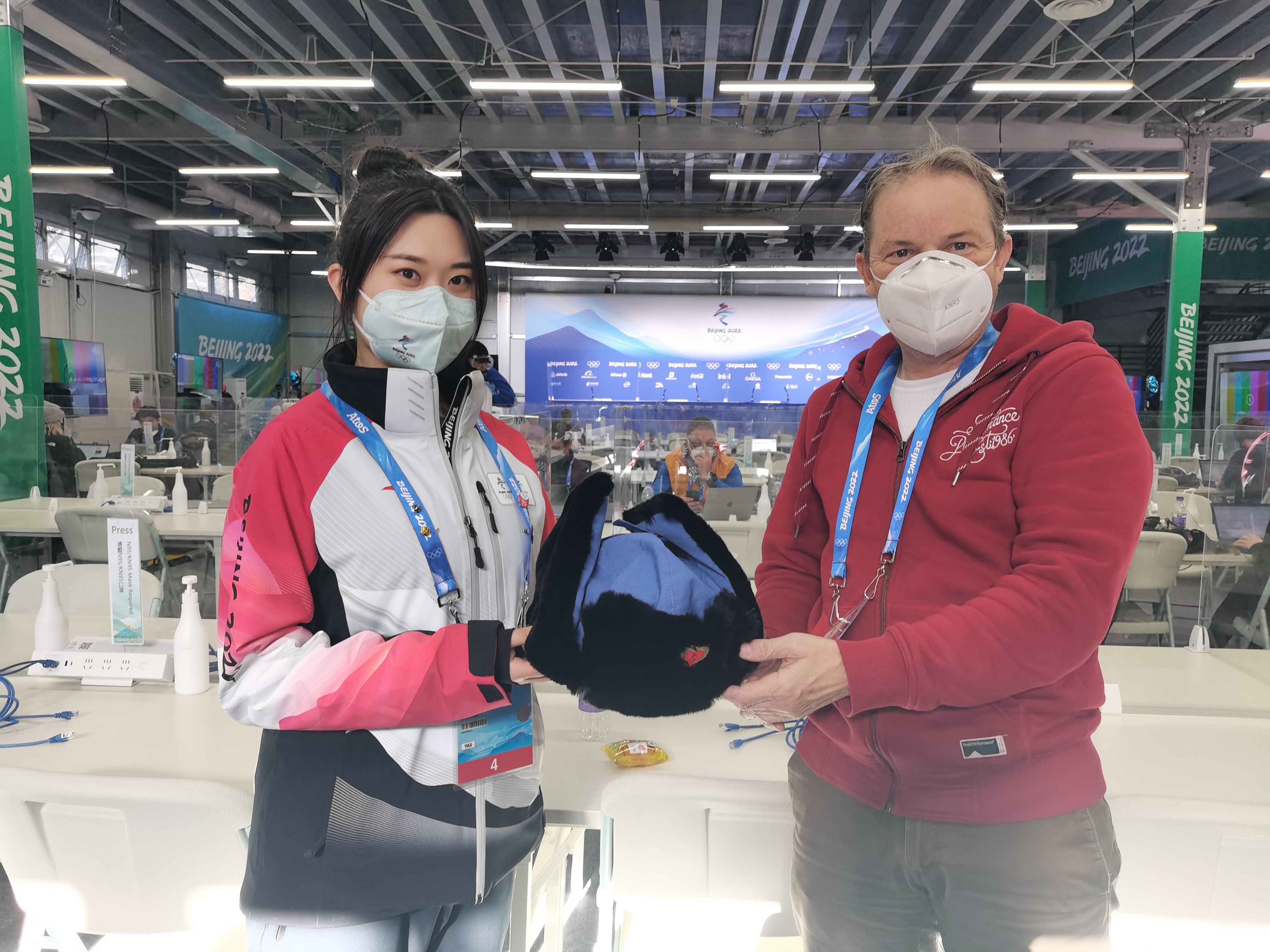 记者工作间主管赵梓彤收到反馈后第一时间帮他联系寻找,但并没有找到。高山赛场比较寒冷,新闻运行团队经商量后,决定将一顶特制帽子第二天带到场馆并送给他,希望他能在温暖舒适的状态下工作。