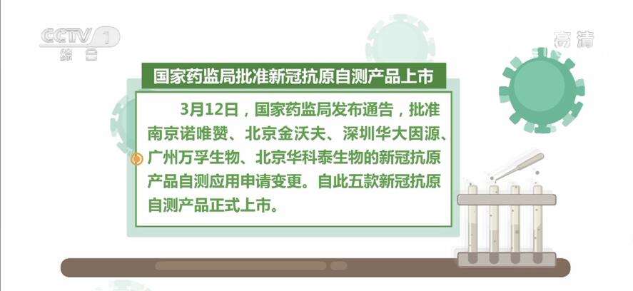 3月12日,国家药监局发布通告,批准南京诺唯赞、北京金沃夫、深圳华大因源、广州万孚生物、北京华科泰生物的新冠抗原产品自测应用申请变更。自此,五款新冠抗原自测产品正式上市。