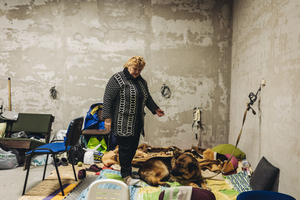 ↑这是3月11日在乌克兰基辅一处安置点的地下室内拍摄的一名女子和她的狗。新华社发(迭戈·埃雷拉摄)