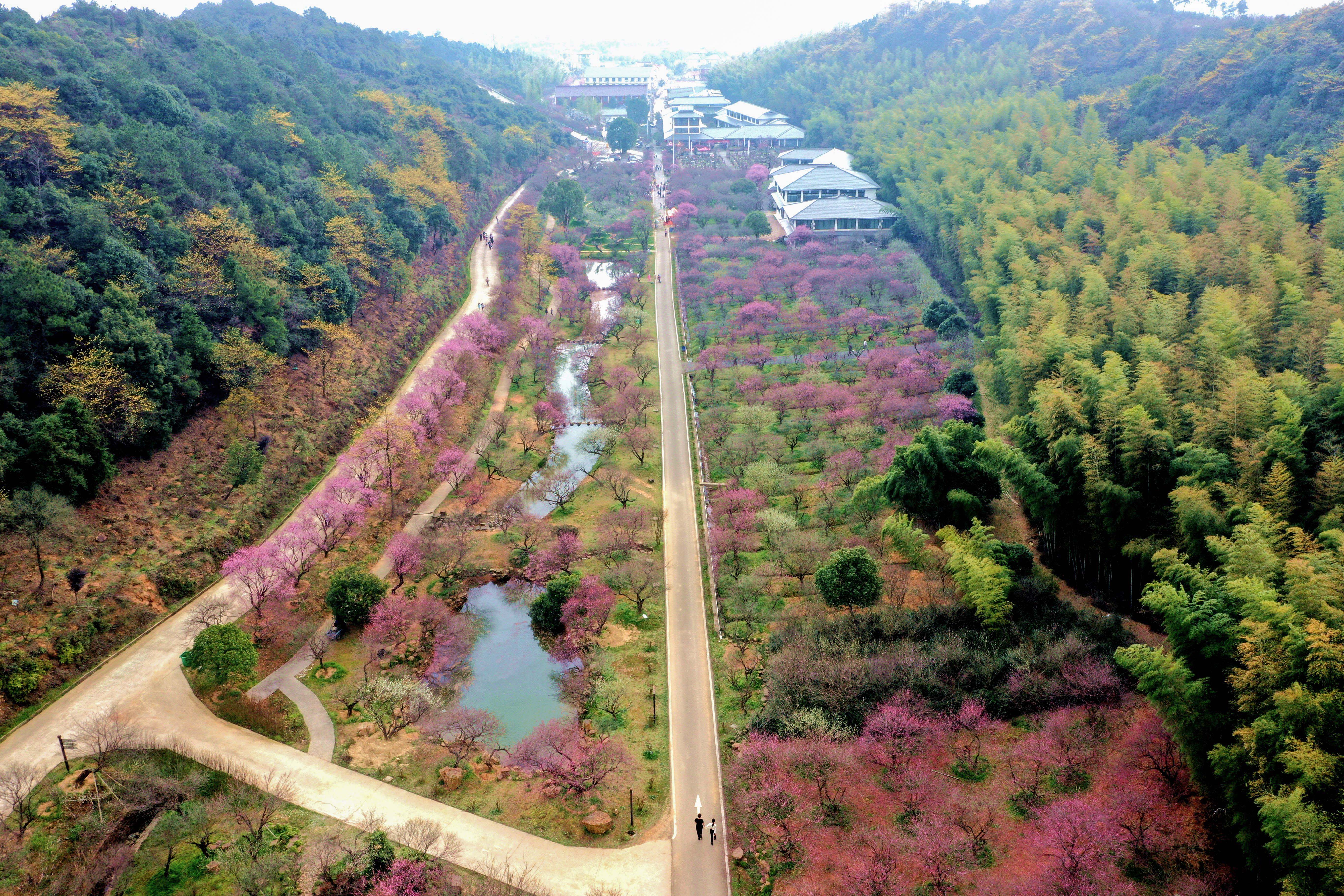 新华社照片,长兴(浙江),2022年3月13日 浙江长兴:万株红梅迎客来 3月13日拍摄的东方梅园(无人机照片)。 近期,浙江省湖州市长兴县龙山街道东方梅园内2万多株梅花进入盛花期,吸引众多市民和游客前来赏梅踏青。 新华社记者 徐昱 摄