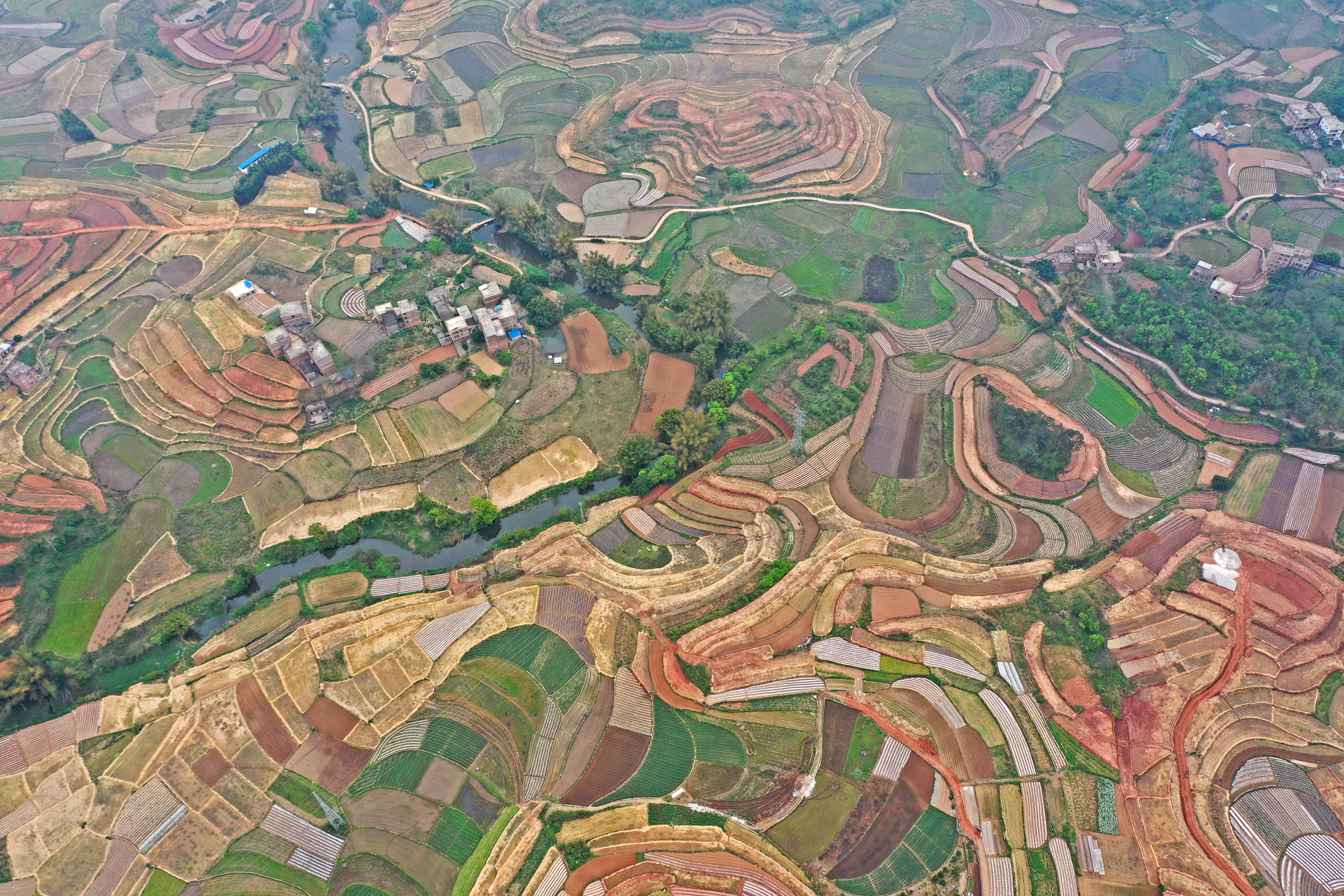 新华社照片,南宁,2022年3月13日 大地调色板 春回大地,广西南宁市邕宁区蒲庙镇纵横交错的田地色彩斑斓,宛如色彩丰富的调色板(3月13日摄,无人机照片)。 新华社记者 周华 摄