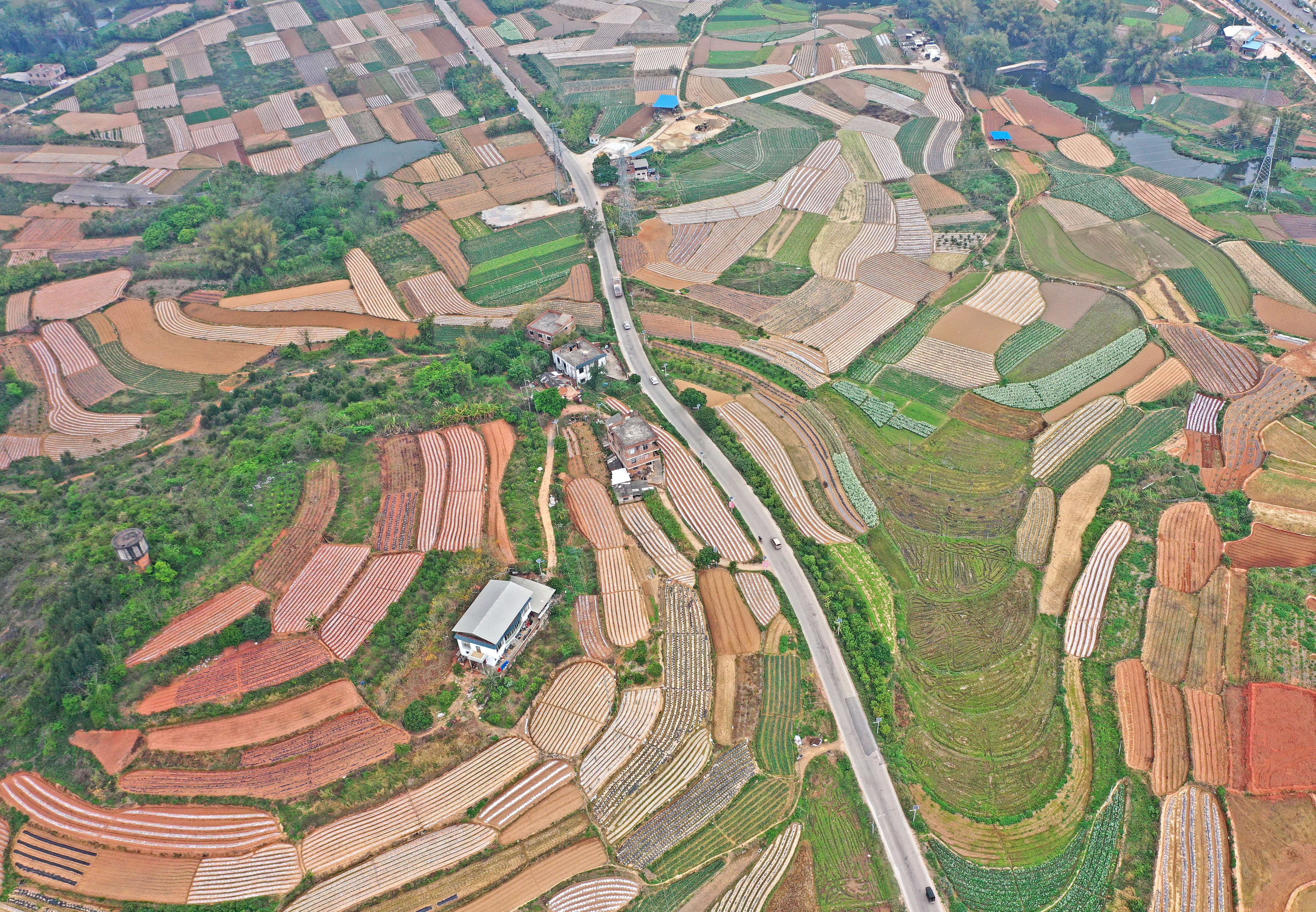 新华社照片,南宁,2022年3月13日 大地调色板 春回大地,广西南宁市邕宁区蒲庙镇纵横交错的田地色彩斑斓,宛如色彩丰富的调色板(3月13日摄,无人机照片)。 新华社记者 周华 摄