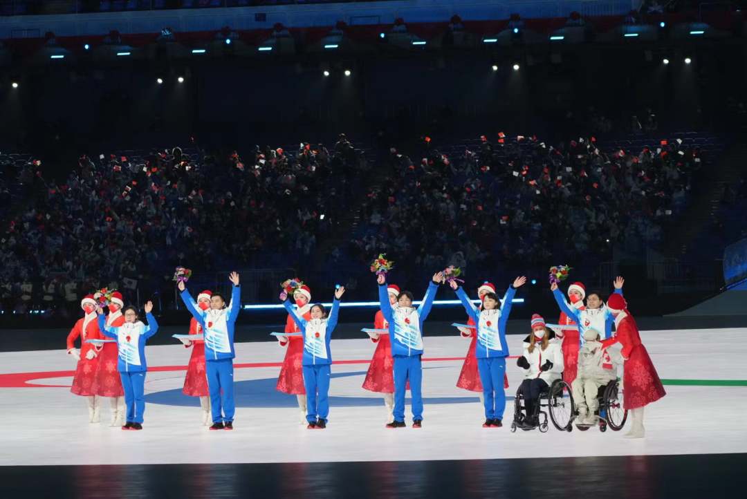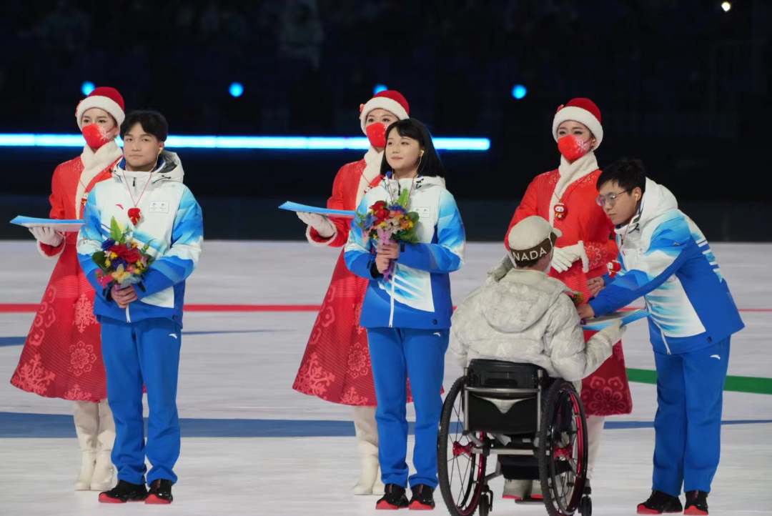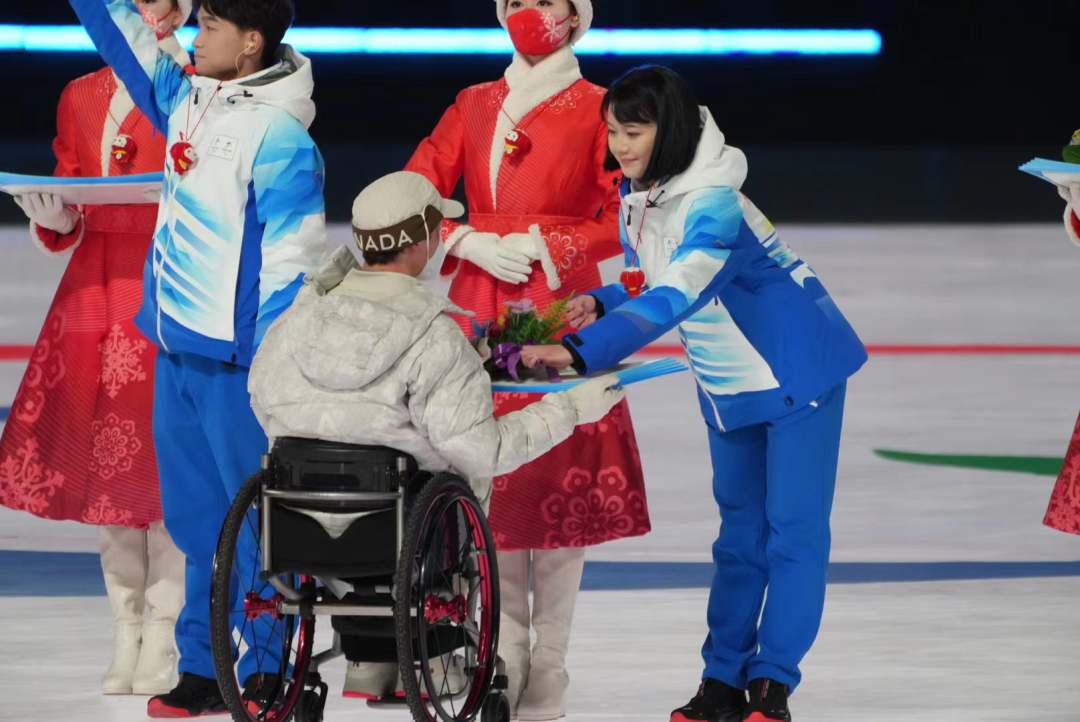 志愿者代表登台后,由国际残奥委会运动员委员会新当选委员向其献花致谢。同时,每位志愿者代表都会得到一个由残疾人朋友手工编织的雪容融挂饰。向所有志愿者说声感谢!