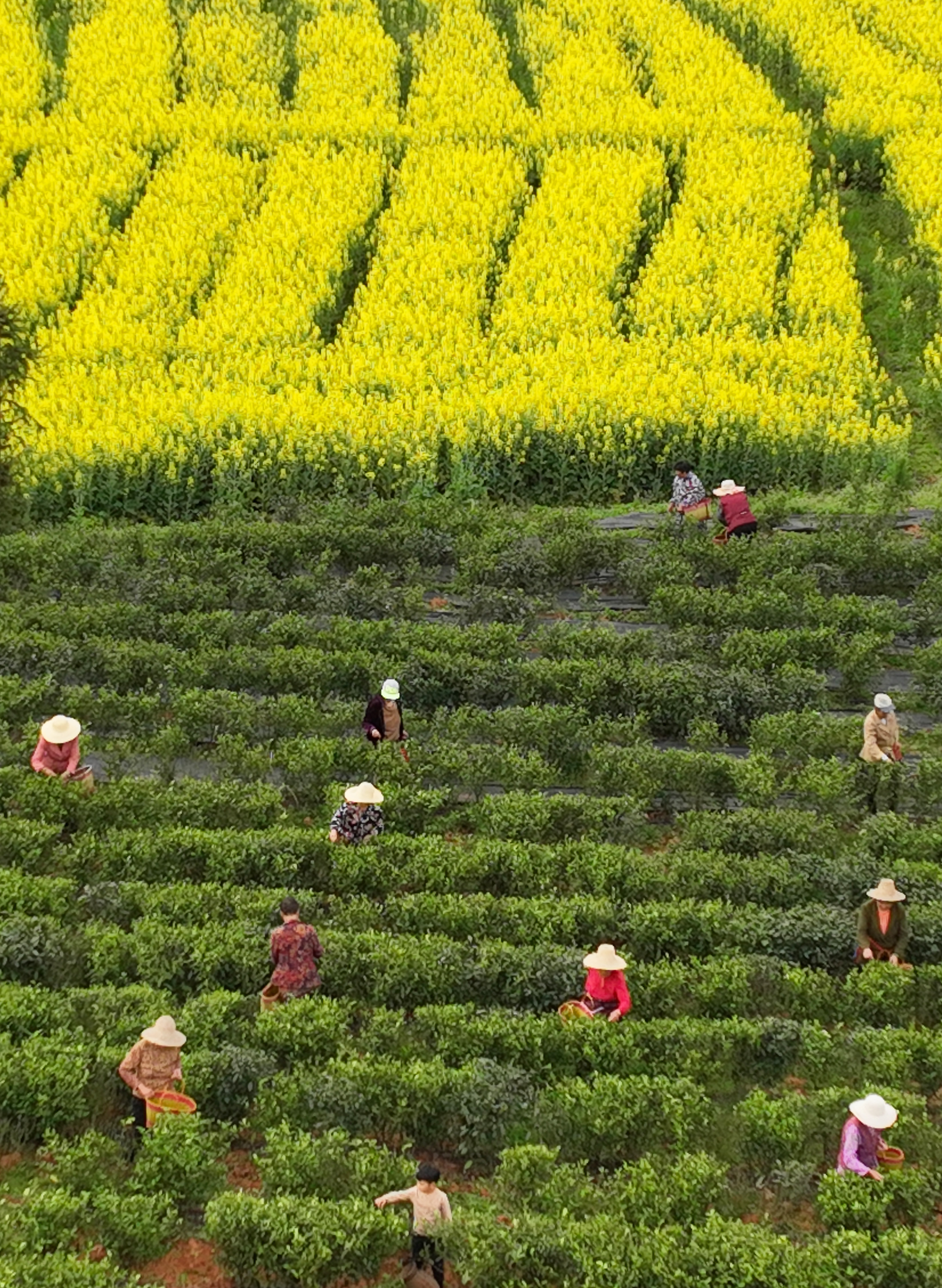 新华社照片,衡阳(湖南),2022年3月13日 春暖花开劳作忙 3月13日,湖南省衡阳市衡南县宝盖镇茶园,当地村民在采摘春茶(无人机照片)。 随着天气回暖,人们抢抓农时开展农业生产,田间地头一片繁忙景象。 新华社发(曹正平摄)
