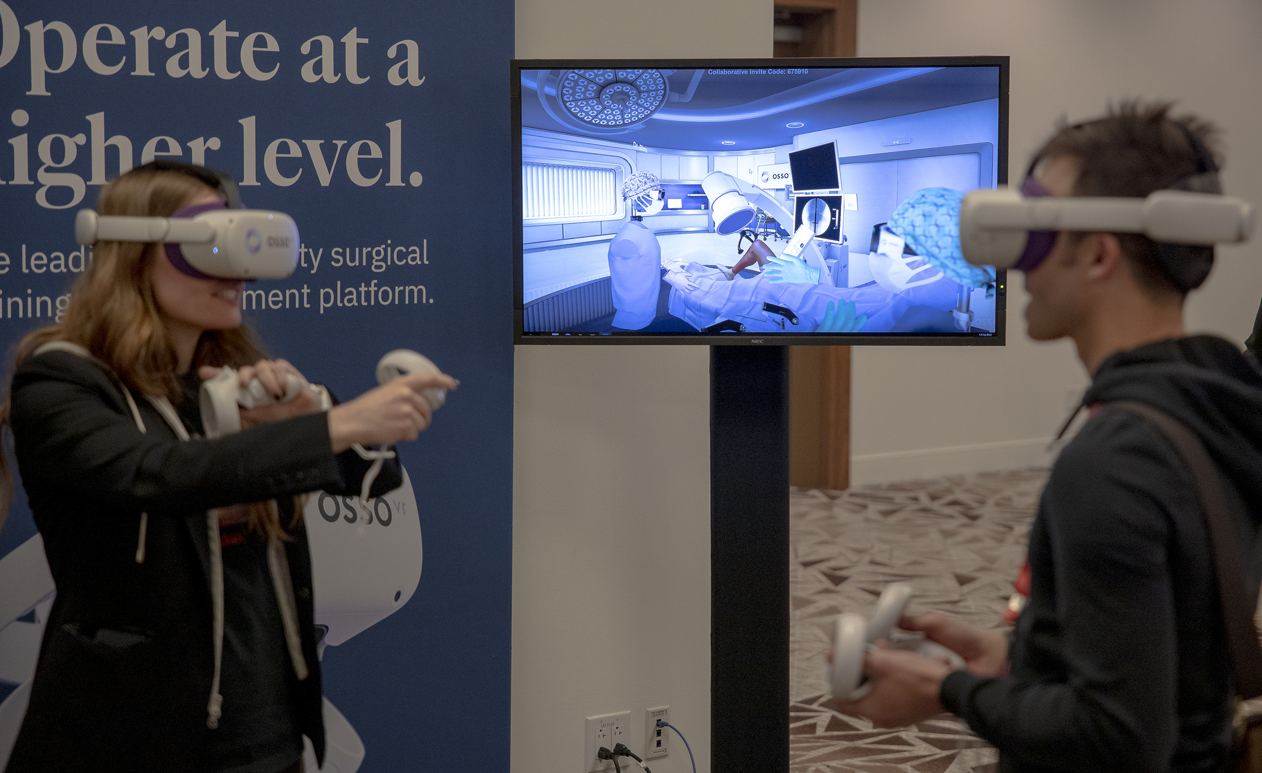新华社照片,奥斯汀,2022年3月13日 (国际·图文互动)(1)记者手记:走进美国“西南偏南”感受多元创新 3月12日,在美国得克萨斯州奥斯汀“西南偏南”多元创新大会和艺术节上,参观者体验利用虚拟现实技术对医疗人员进行训练的创新产品。 (配本社同题文字稿) 新华社发(尼克·瓦格纳摄)