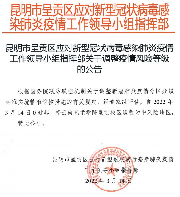 昆明市呈贡区应对新型冠状病毒感染肺炎疫情工作领导小组指挥部3月14日发布关于调整疫情风险等级的公告,自2022年3月14日0时起,将云南艺术学院呈贡校区调整为中风险地区。全文如下: