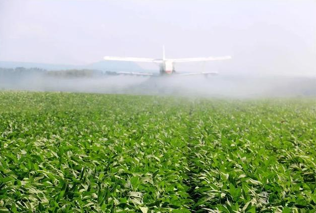 ▲在黑龙江省黑河市五大连池农场,一架农用飞机正在大豆地里作业。新华社发 陆文祥 摄