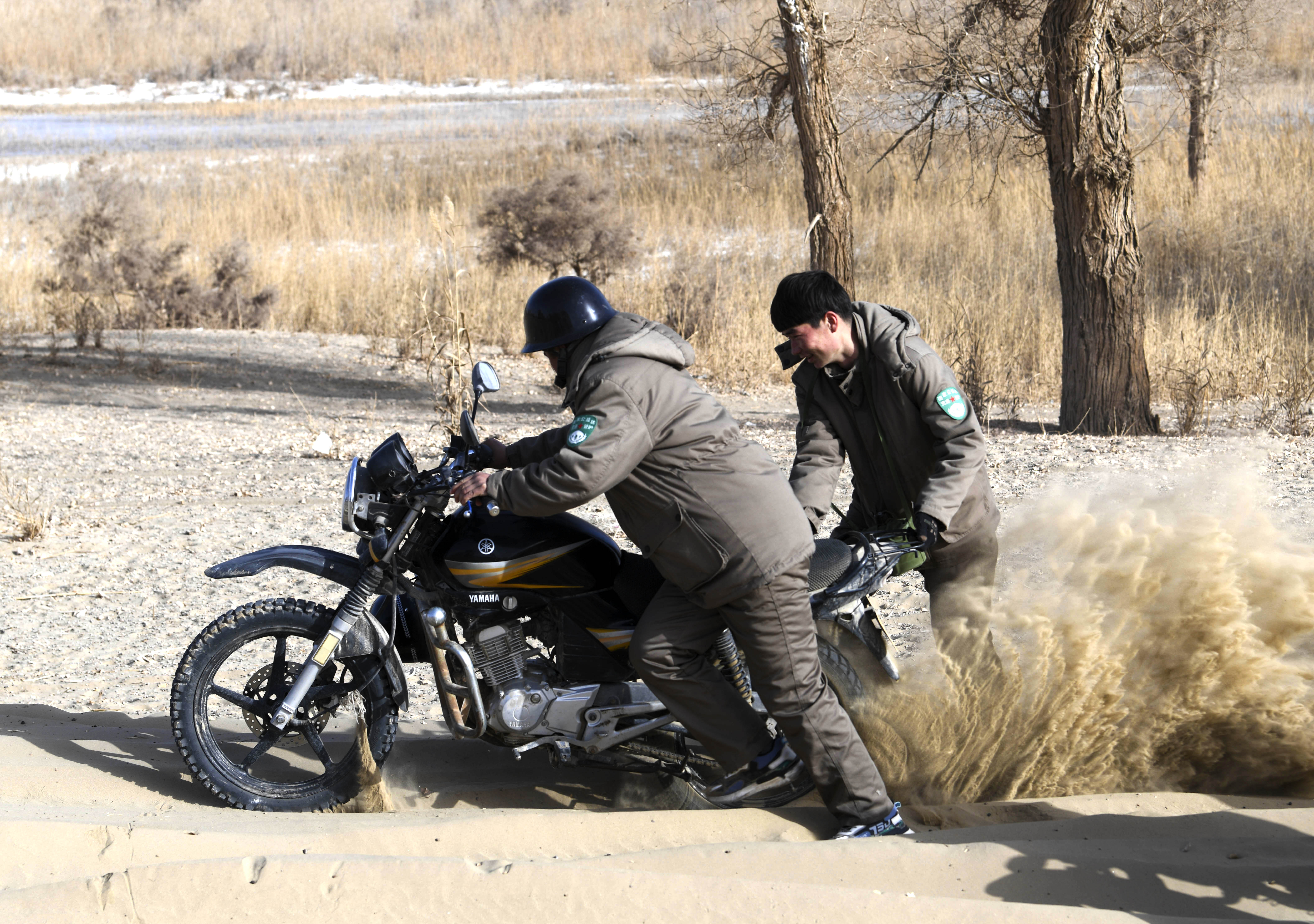 新华社照片,乌鲁木齐,2022年3月14日 寻找拯救胡杨林的英雄——写在塔里木河流域胡杨林拯救行动告成之际 在国家级公益林尉犁县罗湖罗克管护站,“00”后护林员米尔扎提·艾尼瓦尔(右)和同事用力推着摩托车越过沙丘(2月22日摄)。 (配本社同题文字稿) 新华社记者 赵戈 摄