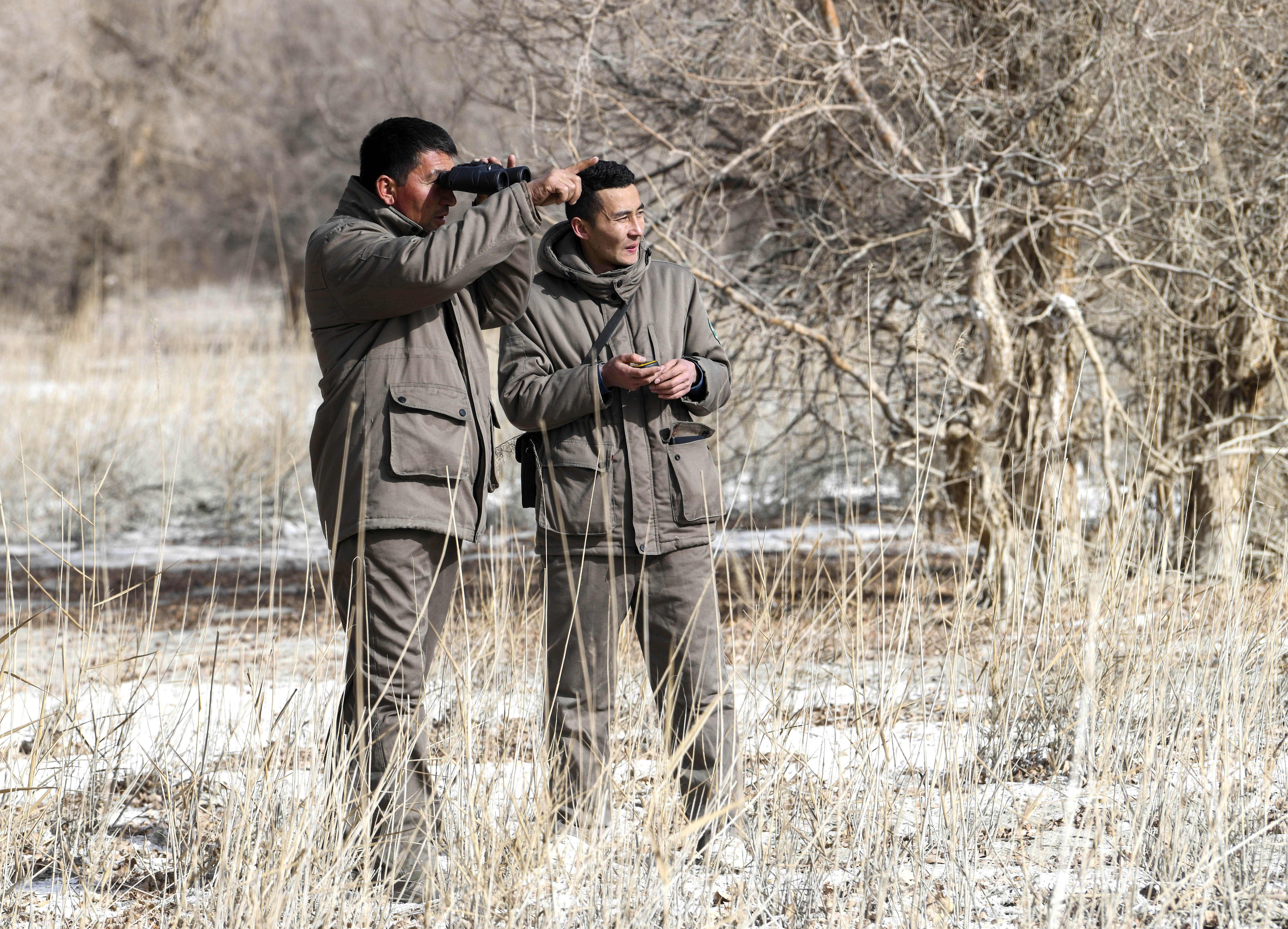 新华社照片,乌鲁木齐,2022年3月14日 寻找拯救胡杨林的英雄——写在塔里木河流域胡杨林拯救行动告成之际 在国家级公益林尉犁县罗湖罗克管护站,从新疆农业大学毕业的吾买尔·热合曼(右)和同事在巡护胡杨(2月22日摄)。 (配本社同题文字稿) 新华社记者 赵戈 摄