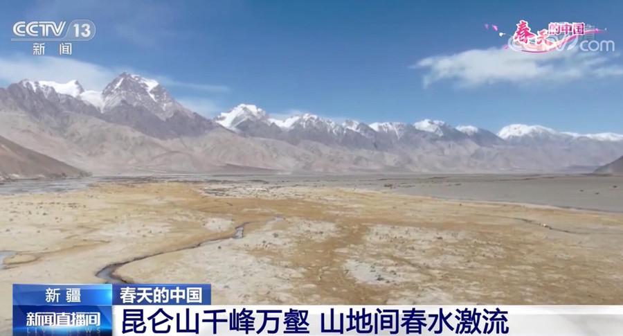 立春后,新疆境内的昆仑山山色黑白相交,更加雄浑有力,蓝天、白云、雪山构成了一幅壮美的画卷。和高山的积雪不同,山下的冰河融化、春水激流,野生牦牛等动物聚集在河边畅饮、吃草,彰显出春天的勃勃生机。