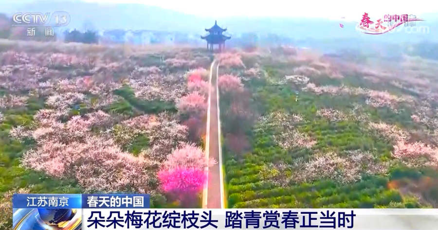 在江苏南京傅家边村,梅花星星点点,陆续绽放。梅树下间植茶树,白色、粉色的梅花与碧绿的茶树相映成趣,远处青瓦白墙的江南民居若隐若现。登高远望,云蒸霞蔚,美景尽收眼底。