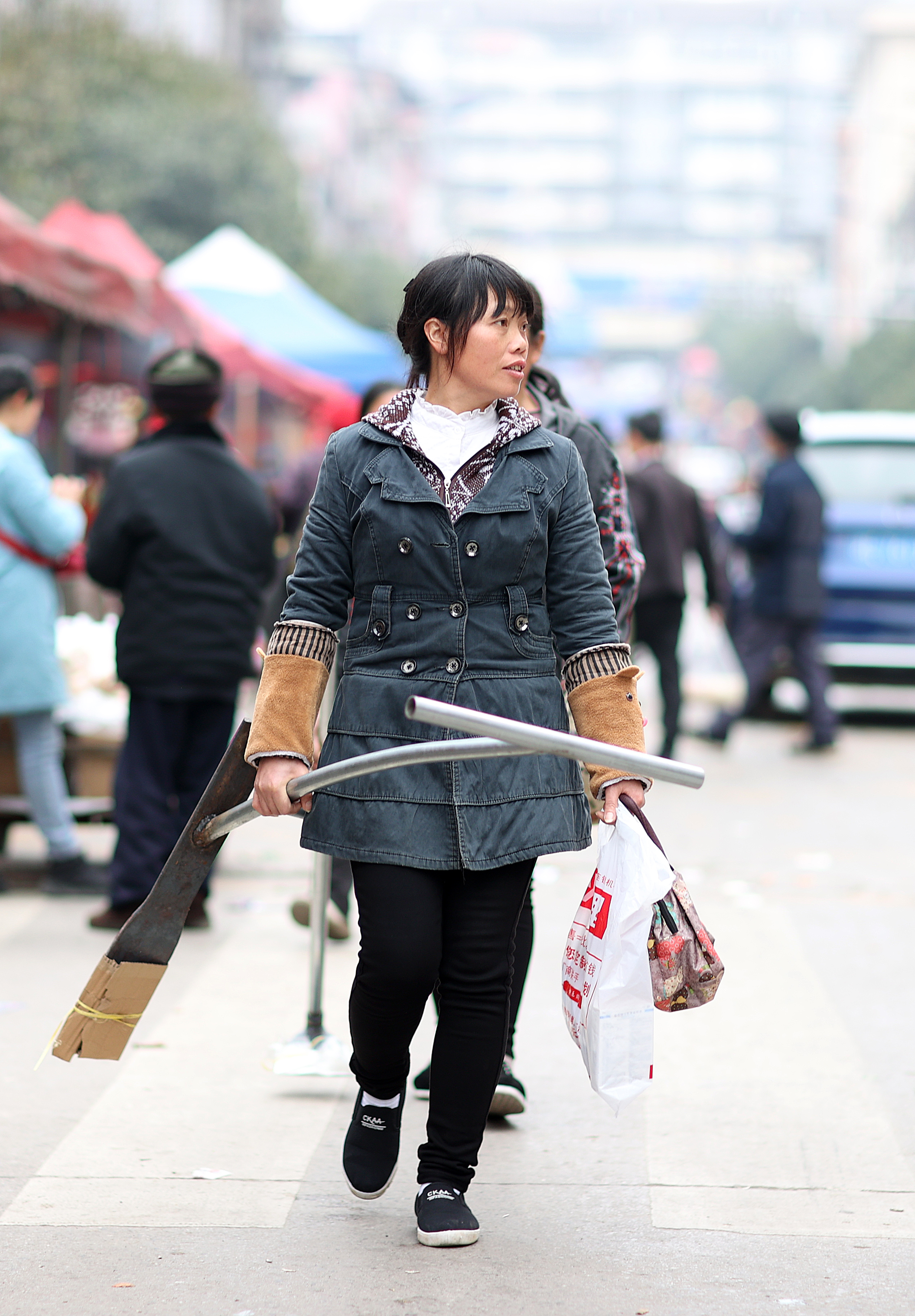新华社照片,丹寨(贵州),2022年3月14日 春天里的集市 3月10日,在贵州省黔东南苗族侗族自治州丹寨县龙泉镇集市上,群众拿着购买的传统农具赶集。 大地回春,又是春忙时节。无论在田间地头,还是乡镇市集,各种充满乡土气息的集市热闹了起来,卖种苗、卖农具、卖鸡苗……四面八方的人们前来赶集,带来满满的人间烟火气。 新华社发(黄晓海 摄)