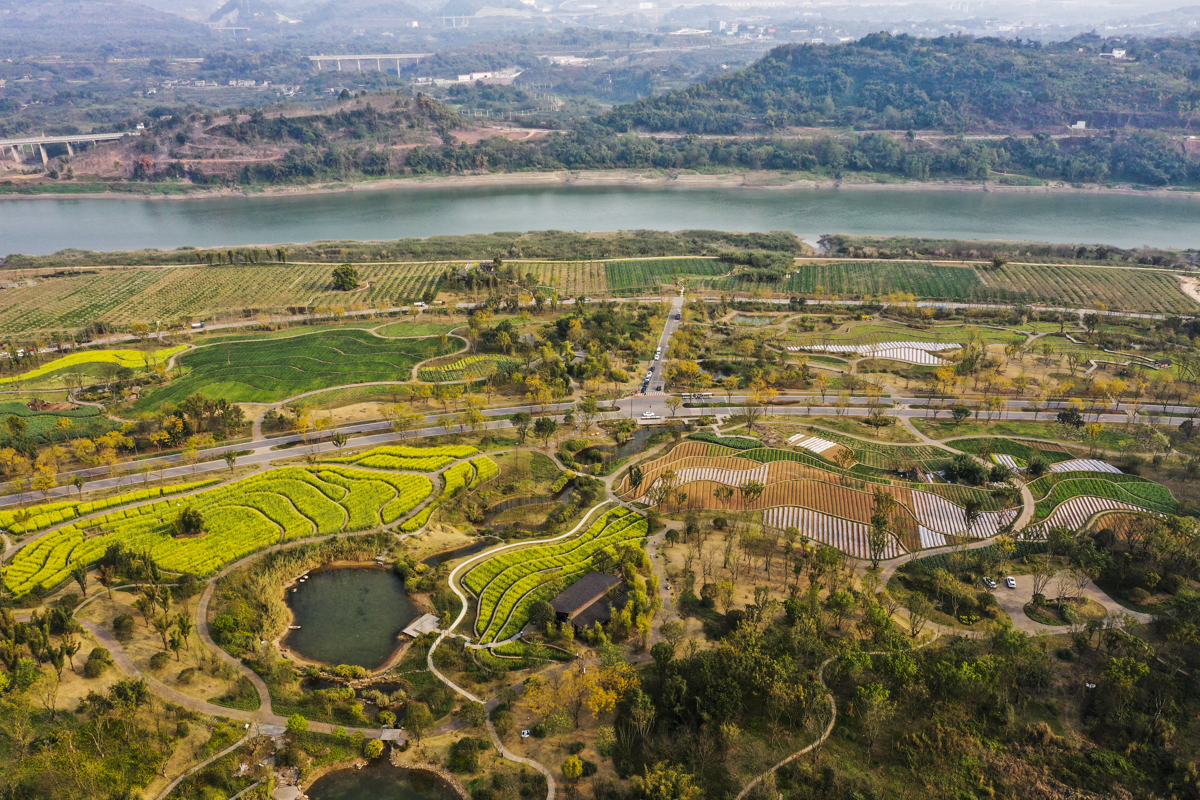 广阳岛上不只有风景,还有巴渝原乡风情——梯田成片、阡陌相连,包菜、辣椒等各种蔬菜长势喜人;应用智慧农业技术,种植水稻、高粱、柑橘等,培养新农人;一座座供人休憩的驿站、院落,富有巴渝建筑特色;喂养的荣昌猪、大足黑山羊、城口山地鸡等,是重庆特有品种。