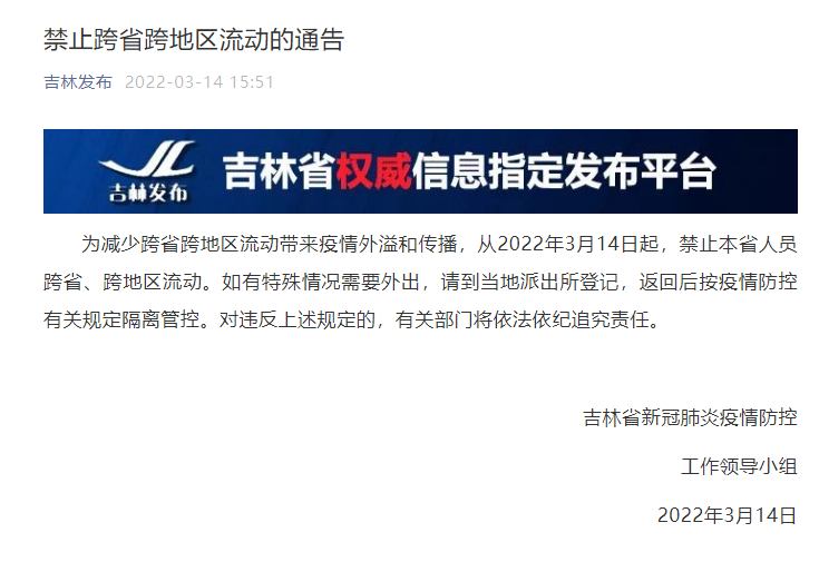 据“吉林发布”公众号消息,为减少跨省跨地区流动带来疫情外溢和传播,从2022年3月14日起,禁止本省人员跨省、跨地区流动。如有特殊情况需要外出,请到当地派出所登记,返回后按疫情防控有关规定隔离管控。对违反上述规定的,有关部门将依法依纪追究责任。