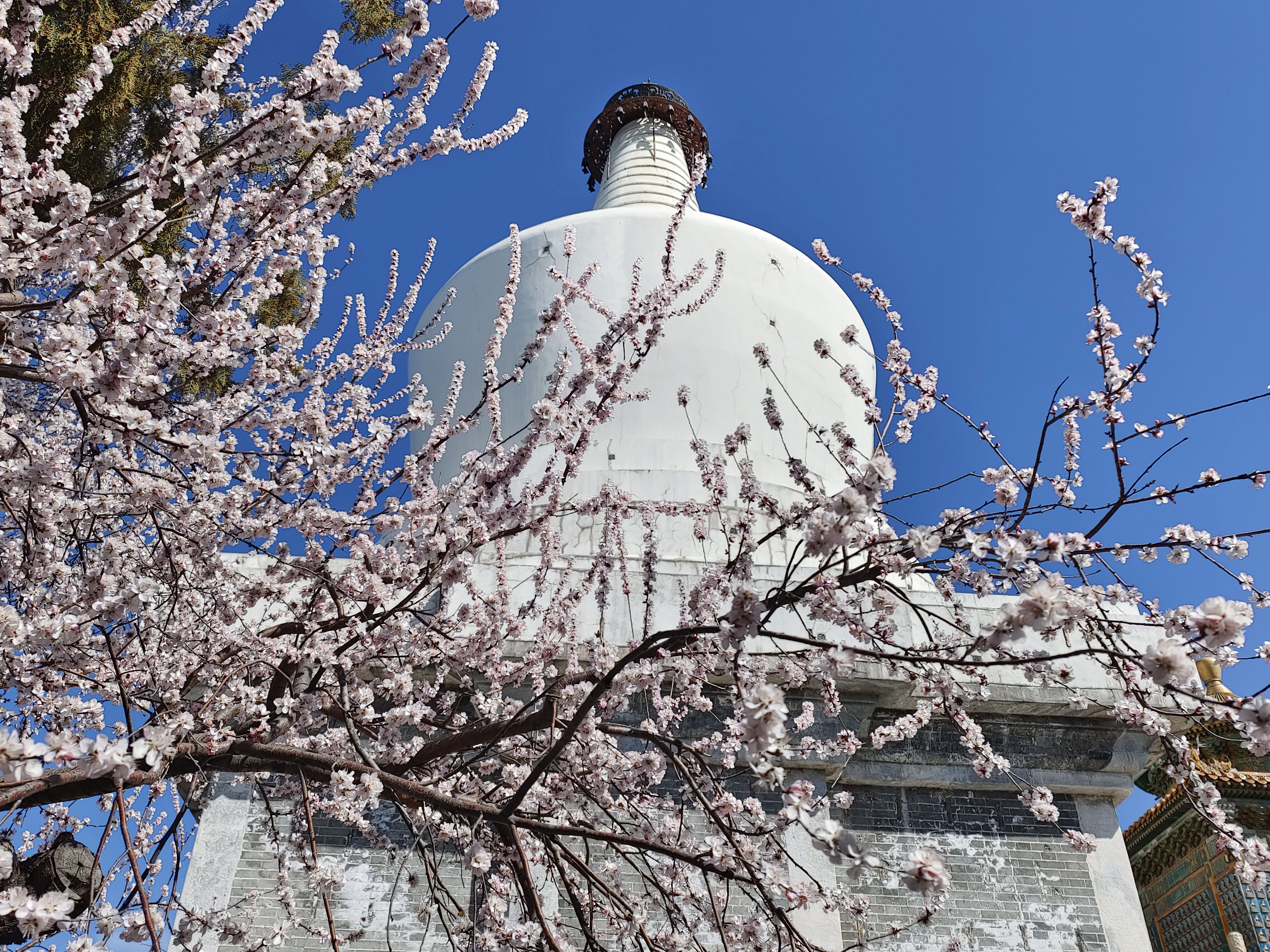 新华社照片,北京,2022年3月14日 北京:山桃花开映白塔 3月14日,盛开的山桃花掩映着北京北海公园白塔。 春暖大地,北京北海公园白塔旁的山桃花盛开,吸引不少游客前来欣赏。 新华社记者 徐金泉 摄