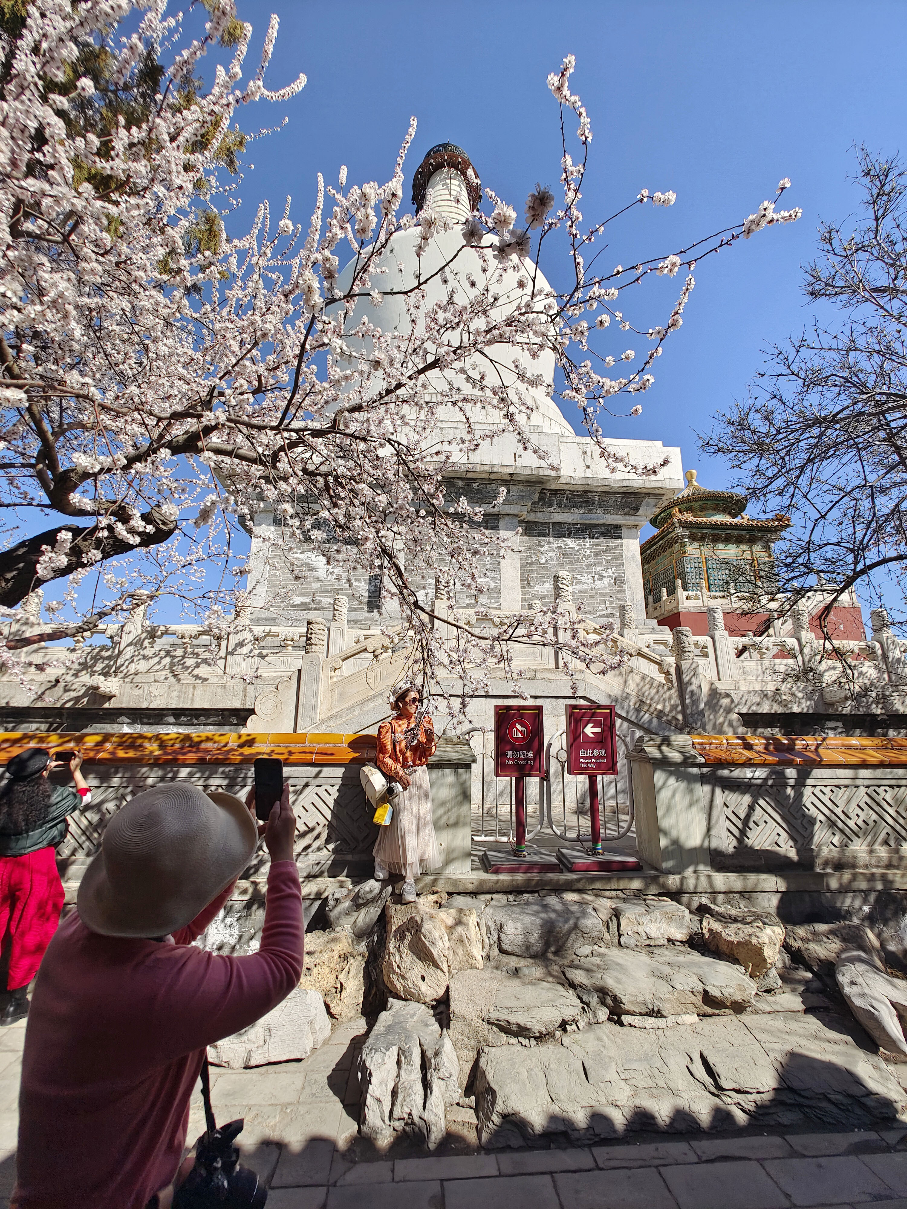 新华社照片,北京,2022年3月14日 北京:山桃花开映白塔 3月14日,游客在北京北海公园白塔旁拍摄盛开的山桃花。 春暖大地,北京北海公园白塔旁的山桃花盛开,吸引不少游客前来欣赏。 新华社记者 徐金泉 摄
