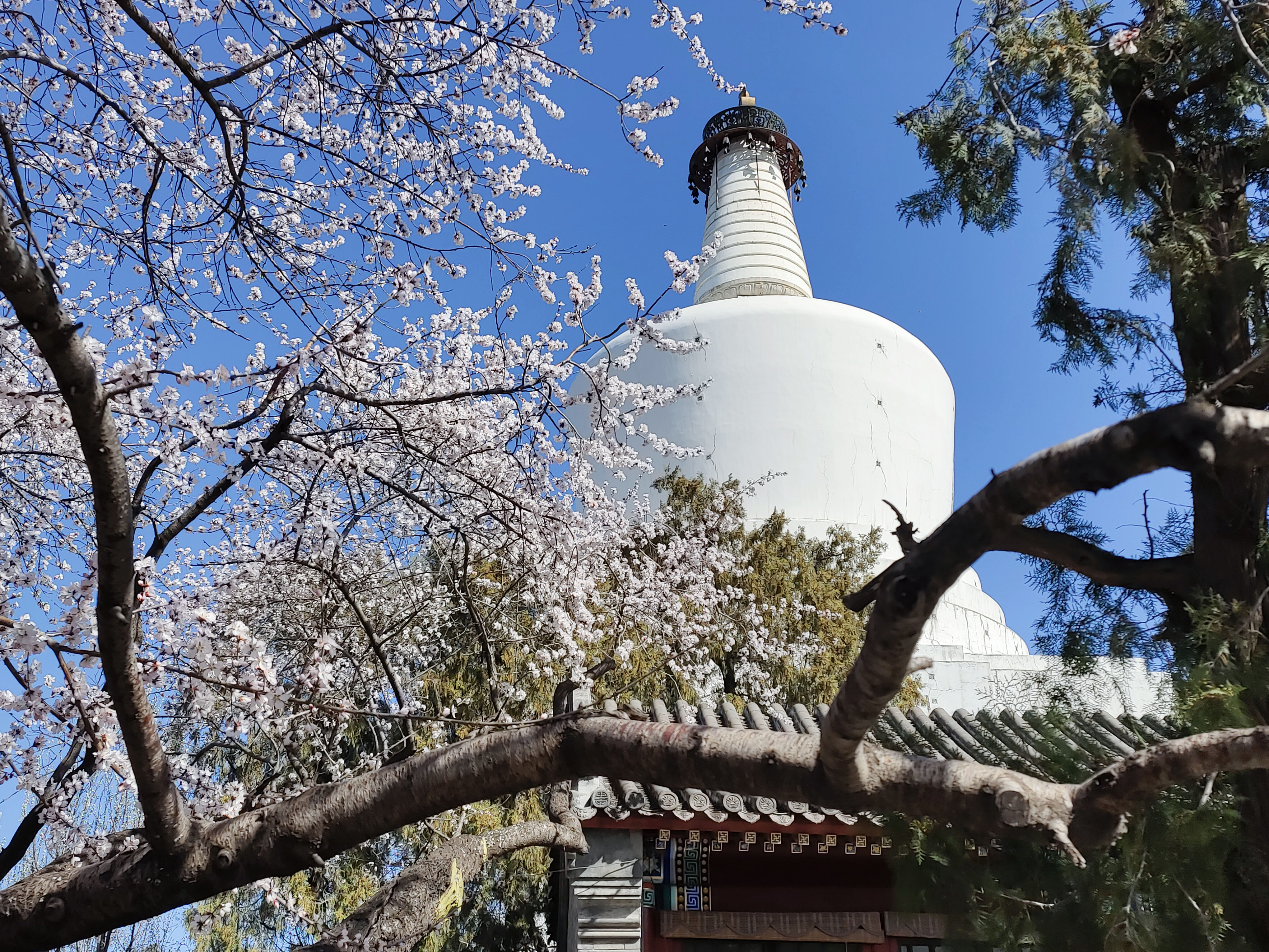 新华社照片,北京,2022年3月14日 北京:山桃花开映白塔 3月14日,盛开的山桃花掩映着北京北海公园白塔。 春暖大地,北京北海公园白塔旁的山桃花盛开,吸引不少游客前来欣赏。 新华社记者 徐金泉 摄