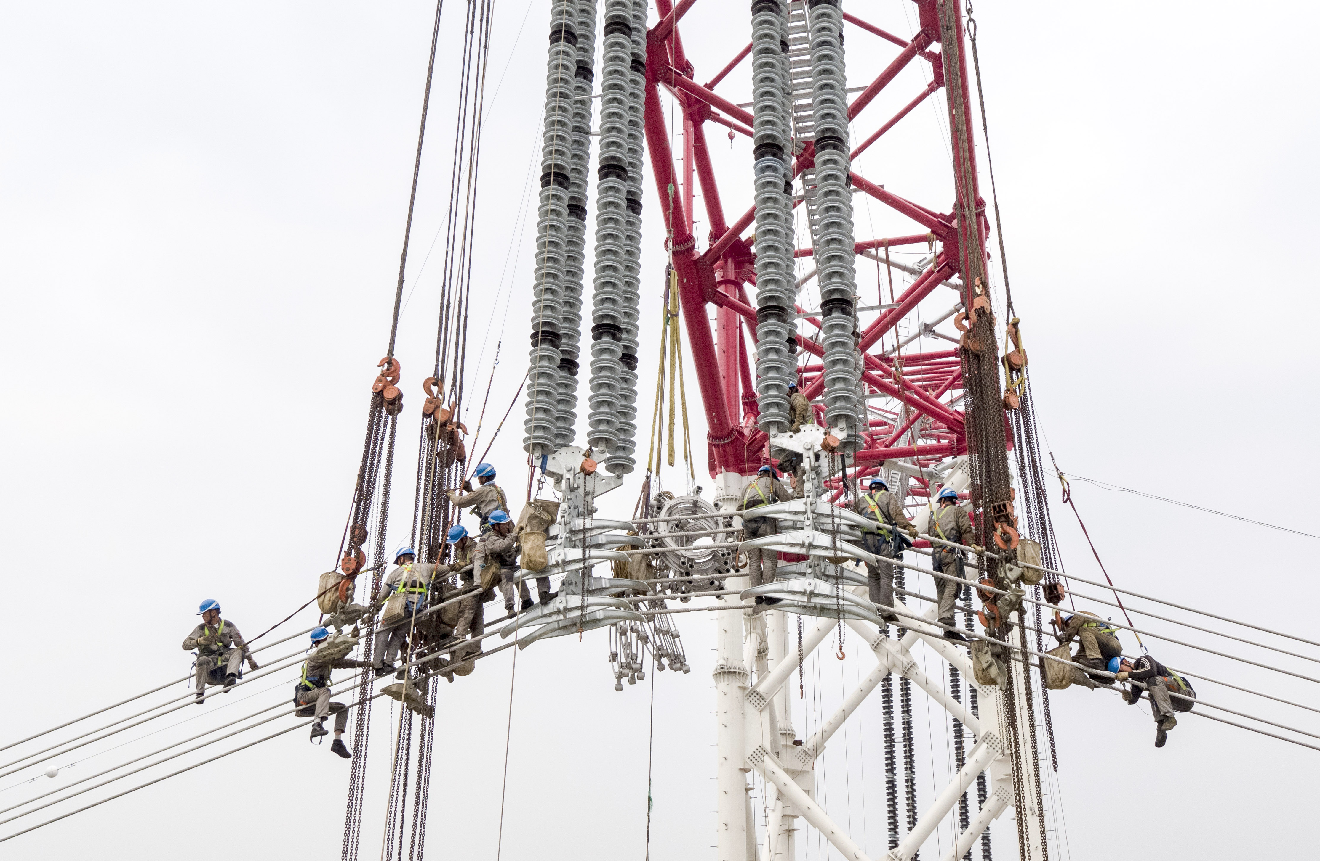 新华社照片,芜湖(安徽),2022年3月14日 特高压“白江线”安徽段长江大跨越线路贯通 3月13日,在安徽芜湖的长江边,安徽送变电工程有限公司施工人员在高空进行特高压输电线路跨江作业(无人机照片)。 3月14日,白鹤滩—江苏±800千伏特高压直流输电工程安徽段跨越长江放线工程完成最后6根导线的展放,标志着特高压“白江线”安徽段长江大跨越线路贯通。 白鹤滩—江苏±800千伏特高压直流输电工程是我国“西电东送”战略的重点工程,是促进国家能源结构调整和节能减排的清洁能源项目。工程投运后,每年输送电力将超过312亿千瓦时。 新华社记者刘军喜摄