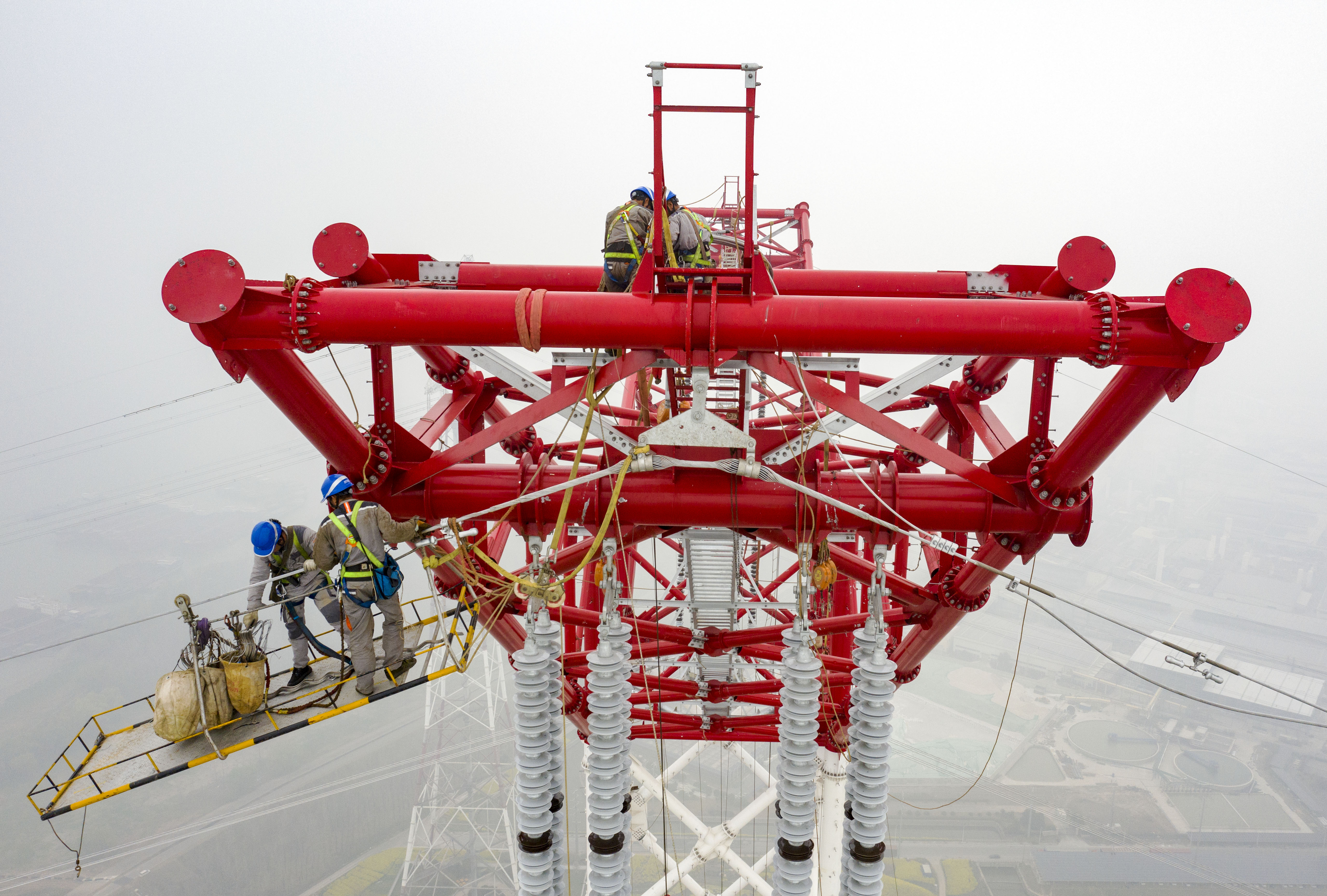新华社照片,芜湖(安徽),2022年3月14日 特高压“白江线”安徽段长江大跨越线路贯通 3月14日,在安徽芜湖的长江边,安徽送变电工程有限公司施工人员在高空进行特高压输电线路跨江作业(无人机照片)。 3月14日,白鹤滩—江苏±800千伏特高压直流输电工程安徽段跨越长江放线工程完成最后6根导线的展放,标志着特高压“白江线”安徽段长江大跨越线路贯通。 白鹤滩—江苏±800千伏特高压直流输电工程是我国“西电东送”战略的重点工程,是促进国家能源结构调整和节能减排的清洁能源项目。工程投运后,每年输送电力将超过312亿千瓦时。 新华社记者周牧摄