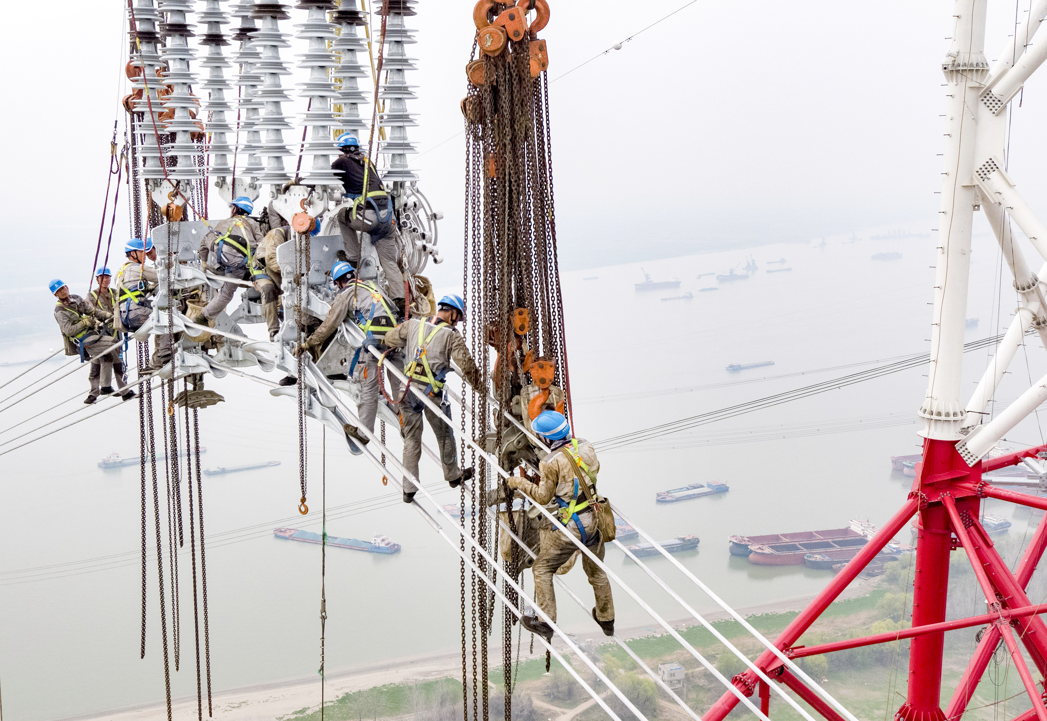 新华社照片,芜湖(安徽),2022年3月14日 特高压“白江线”安徽段长江大跨越线路贯通 3月13日,在安徽芜湖的长江边,安徽送变电工程有限公司施工人员在高空进行特高压输电线路跨江作业(无人机照片)。 3月14日,白鹤滩—江苏±800千伏特高压直流输电工程安徽段跨越长江放线工程完成最后6根导线的展放,标志着特高压“白江线”安徽段长江大跨越线路贯通。 白鹤滩—江苏±800千伏特高压直流输电工程是我国“西电东送”战略的重点工程,是促进国家能源结构调整和节能减排的清洁能源项目。工程投运后,每年输送电力将超过312亿千瓦时。 新华社记者周牧摄