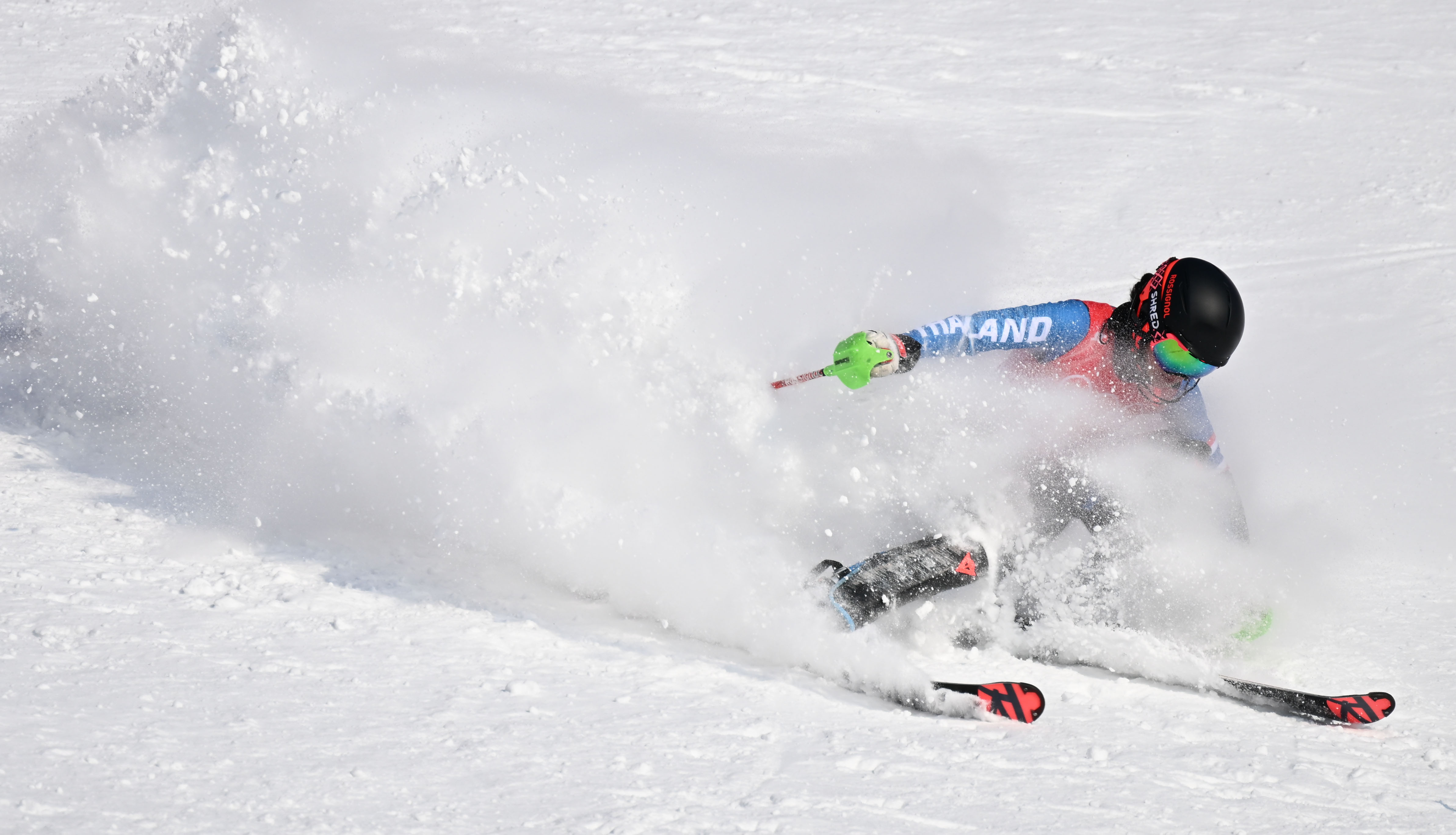 2月9日,泰国选手米达·法赫·寨曼在北京冬奥会高山滑雪女子回转比赛中。新华社记者张晨霖摄