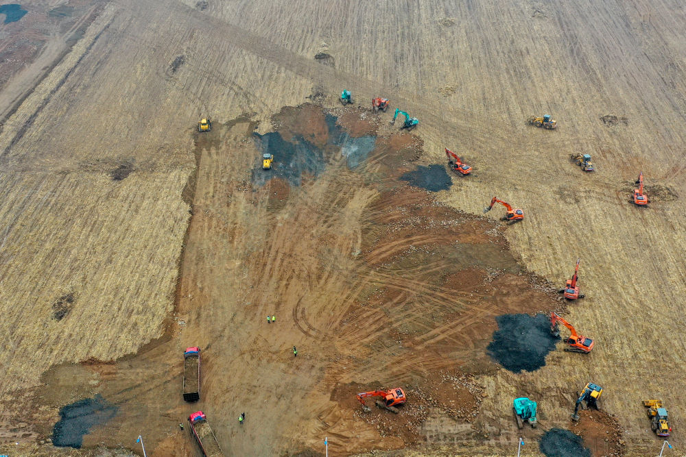 3月13日,工程机械在吉林市高新南区隔离方舱现场施工(无人机照片)。新华社记者 张楠 摄