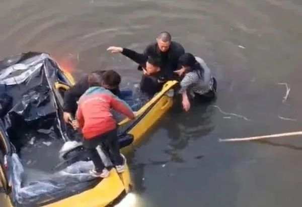 江苏泰州一小轿车坠河,路过的桑广芹等四人跳入河中齐力将被困司机救出。