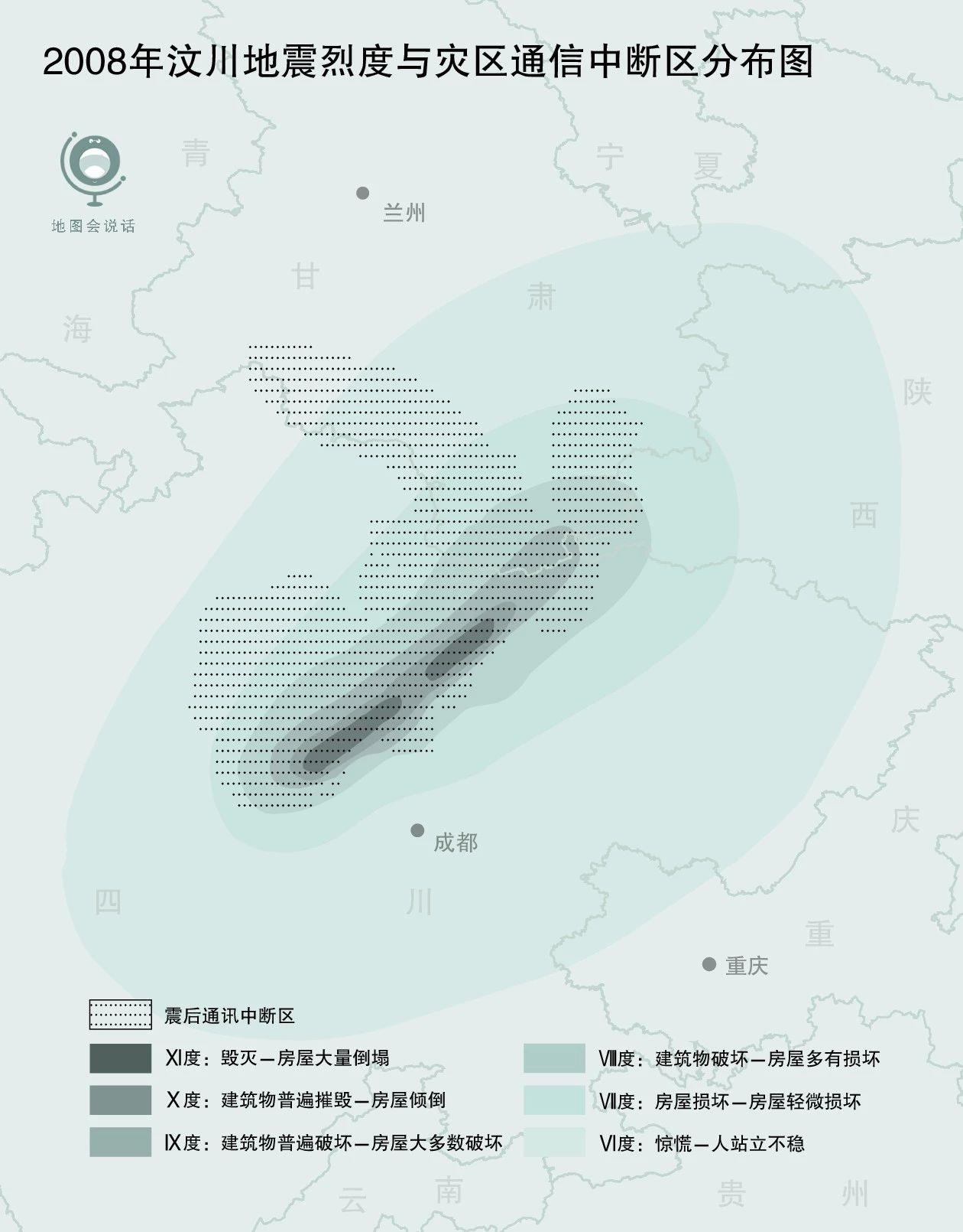 △2008年汶川地震烈度图与灾区通信中断分布图
