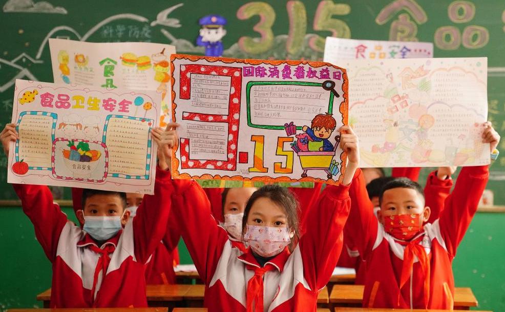 河北省邯郸市峰峰矿区滨河小学的学生展示自己制作的“3·15”主题手抄报。