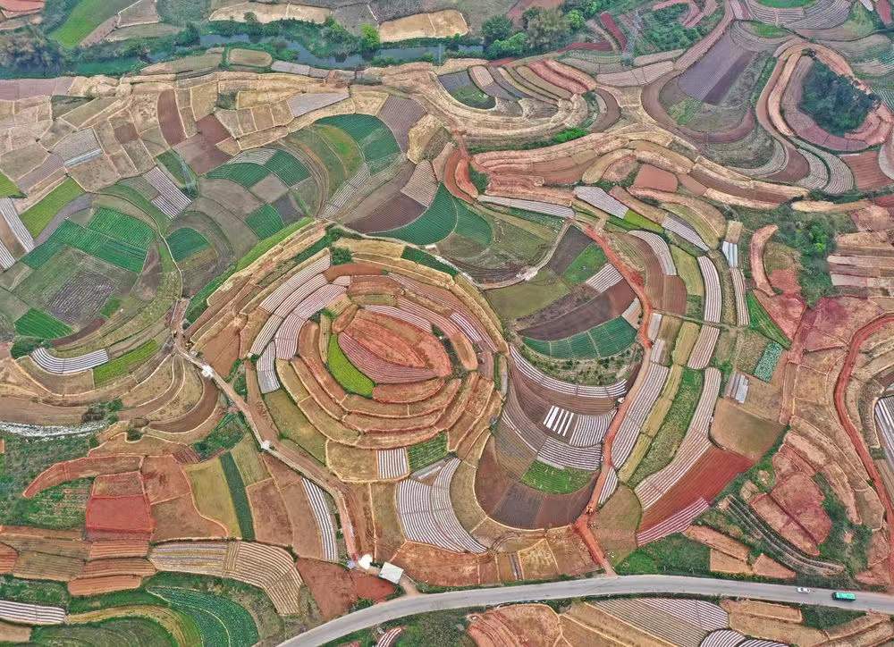 春回大地,广西南宁市邕宁区蒲庙镇纵横交错的田地色彩斑斓,宛如色彩丰富的调色板。