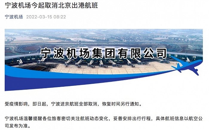 据“宁波机场”微信公众号3月15日消息,受疫情影响,即日起,宁波进京航班全部取消,恢复时间另行通知。