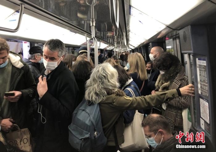 当地时间3月14日,法国取消大部分防疫限制措施。同日起,法国展开第四剂新冠疫苗接种。图为当天在拥挤的巴黎地铁上,大部分乘客仍然戴口罩。中新社记者 李洋 摄