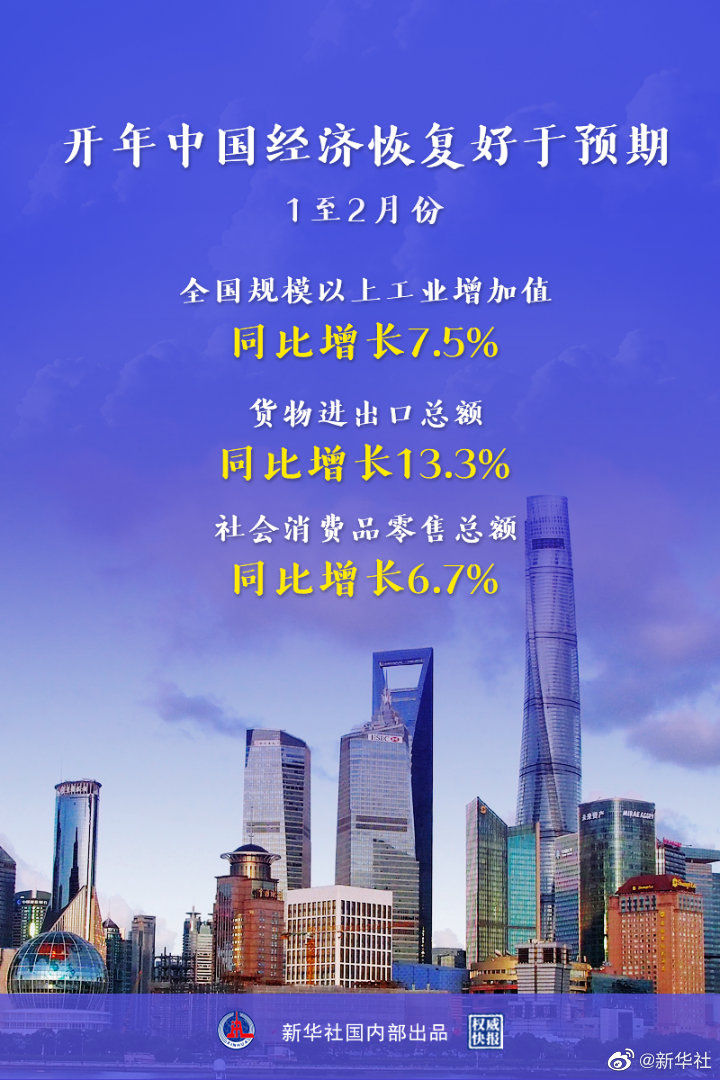 【权威快报丨开年中国经济恢复好于预期】国家统计局15日发布的数据显示,1至2月份,全国规模以上工业增加值同比增长7.5%;社会消费品零售总额74426亿元,同比增长6.7%;货物进出口总额62044亿元,同比增长13.3%。多重风险挑战下,开年中国经济恢复好于预期,为实现全年经济社会发展目标打下基础。(记者魏玉坤、王雨萧,海报设计乔昕)