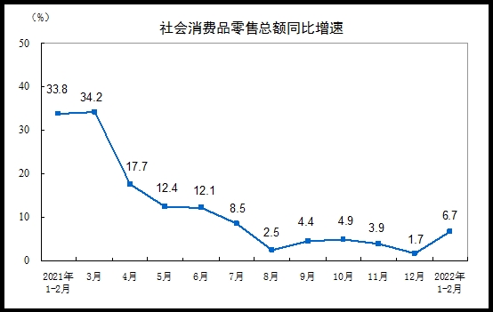 据国家统计局网站消息,1—2月份,社会消费品零售总额74426亿元,同比增长6.7%。其中,除汽车以外的消费品零售额67305亿元,增长7.0%。扣除价格因素,1—2月份社会消费品零售总额同比实际增长4.9%。