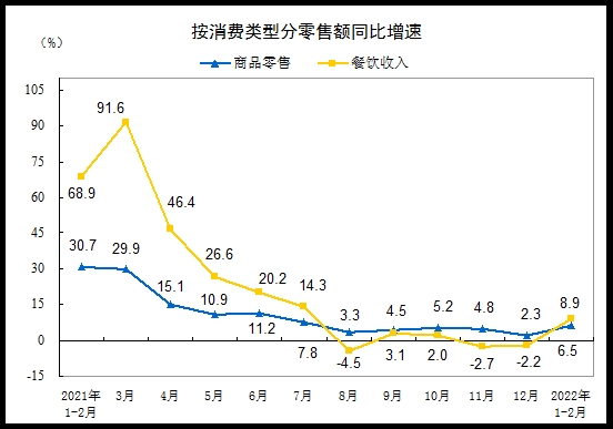 按消费类型分,1—2月份,商品零售66708亿元,同比增长6.5%;餐饮收入7718亿元,同比增长8.9%。