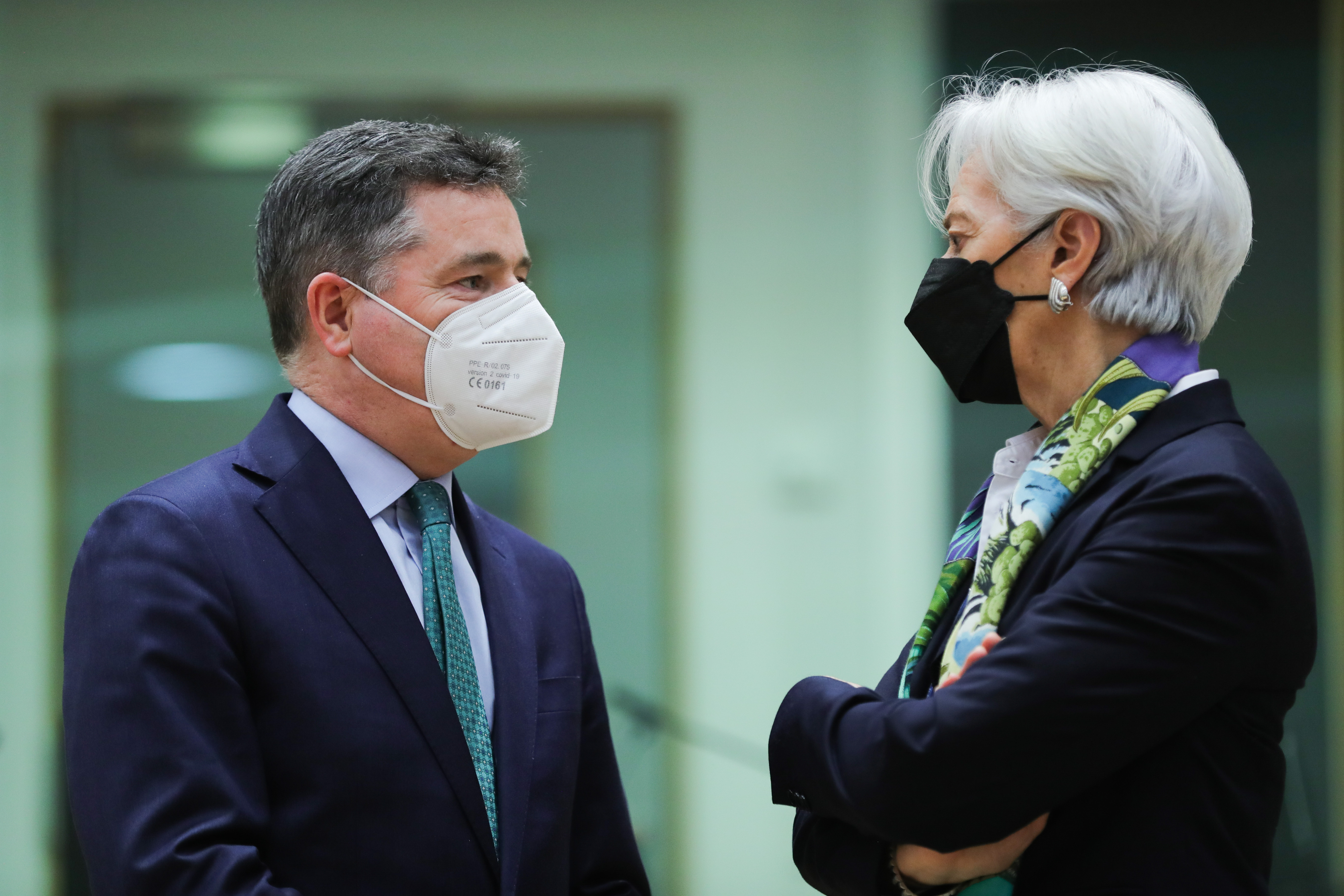 新华社照片,布鲁塞尔,2022年3月15日 (国际)(3)欧元集团会议在比利时布鲁塞尔举行 3月14日,欧元集团主席帕斯卡尔·多诺霍(左)与欧洲央行行长拉加德在比利时布鲁塞尔出席欧元集团会议时交谈。 当天,欧元集团会议在比利时布鲁塞尔举行。 新华社记者 郑焕松 摄