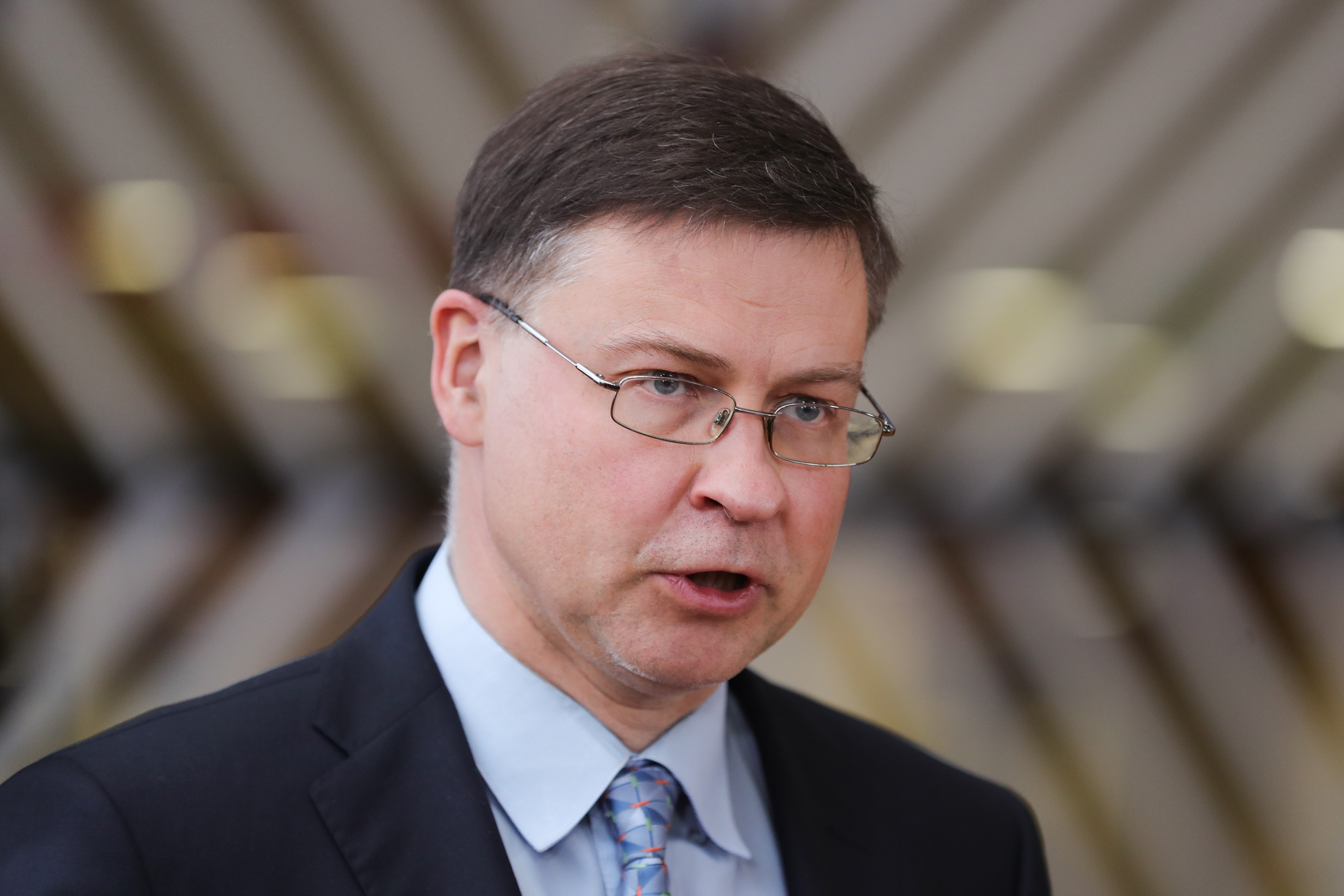 新华社照片,布鲁塞尔,2022年3月15日 (国际)(5)欧元集团会议在比利时布鲁塞尔举行 3月14日,欧盟委员会负责经济事务的执行副主席瓦尔季斯·东布罗夫斯基斯在比利时布鲁塞尔出席欧元集团会议前对媒体发言。 当天,欧元集团会议在比利时布鲁塞尔举行。 新华社记者 郑焕松 摄