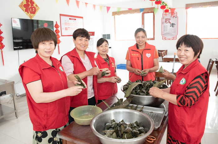 寇家坞四村新时代文明实践站的志愿者在给老人们包粽子