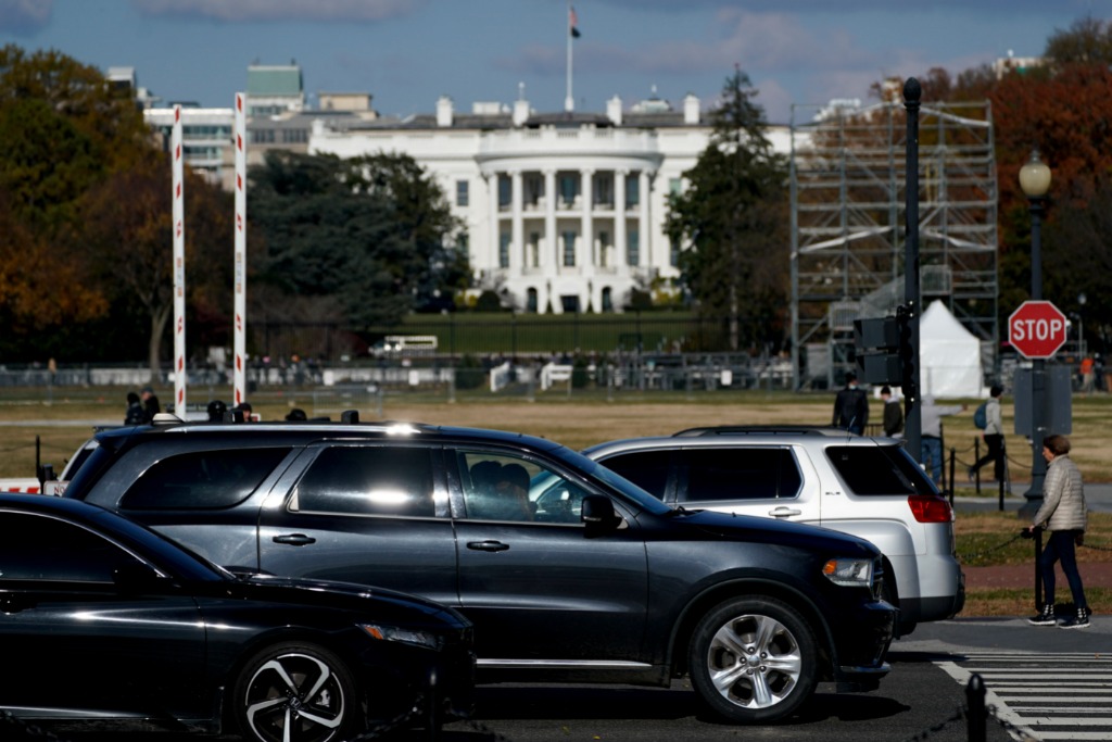2021年11月23日,在美国首都华盛顿,车辆从白宫附近驶过。(新华社发,沈霆摄)
