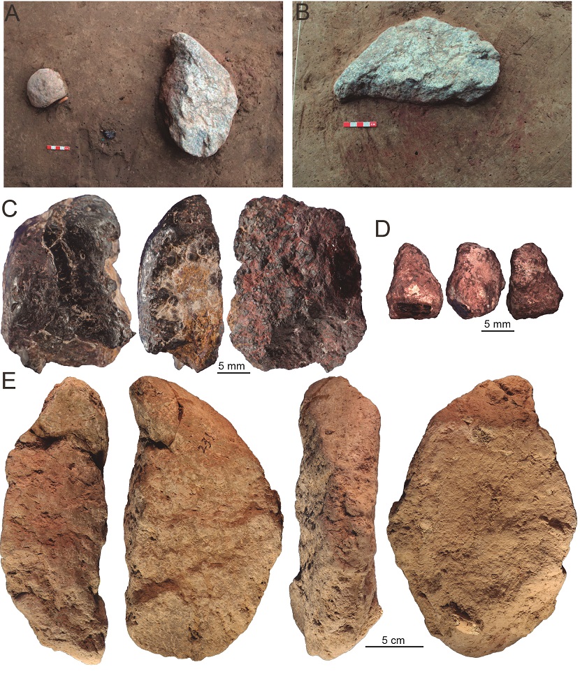 根据拉曼光谱、X射线荧光光谱等技术分析,确认一处富集赤铁矿的染色区,发现较大的研磨盘、研磨球以及赤铁矿碎块,部分赤铁矿石表面发现摩擦痕迹,推测为加工赤铁矿颜料的现场。