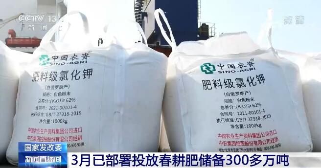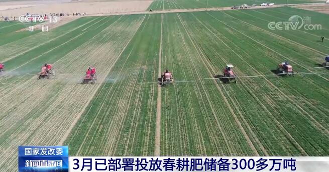央视网消息:记者从国家发展改革委了解到,今年3月起,2022年度第1批300多万吨春耕肥储备已开始向市场投放。