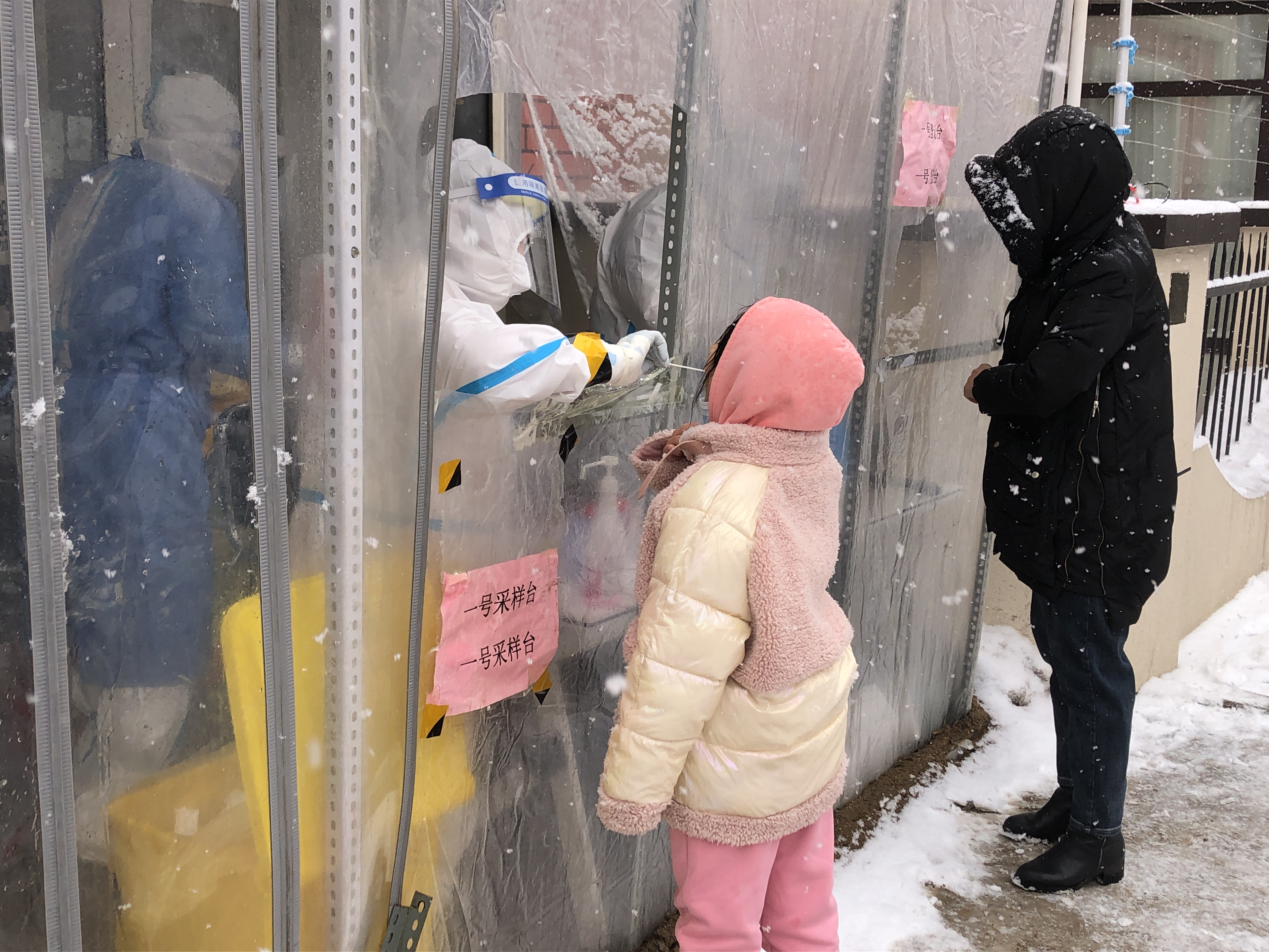 新华社照片,长春,2022年3月15日 吉林省新增本土病例超3000例 3月15日,在长春市朝阳区镇江路一处核酸检测点,工作人员为居民进行核酸检测采样(手机照片)。 当日,记者从吉林省卫健委获悉,3月14日0-24时,全省新增本地确诊病例3076例(轻型3059例,普通型17例)。3月15日0-9时,全省新增本地确诊病例317例(均为轻型)。 新华社记者 褚晓亮 摄