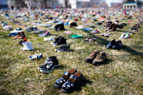 图为2018年3月13日,在美国首都华盛顿,国会山前的草坪上摆放着代表枪击事件中遇难儿童的鞋子。(新华社发,沈霆摄)