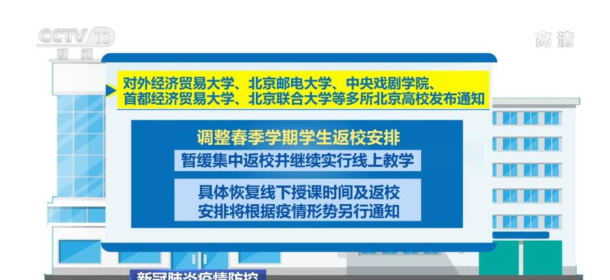 对外经济贸易大学、北京邮电大学、中央戏剧学院、首都经济贸易大学、北京联合大学等多所北京高校发布通知,调整春季学期学生返校安排,暂缓集中返校并继续实行线上教学,具体恢复线下授课时间及返校安排将根据疫情形势另行通知。清华大学加强校园疫情防控管理,实行学生进出校“审批制”,并定期对在校学生安排核酸检测抽检,收到通知72小时内未完成者紫荆码将被置红,并在提交核酸检测阴性结果后调整为绿码。北京大学发布通知,对7日内返京的已返校学生、频繁出入校毕业年级学生两部分群体开展免费核酸筛查,核酸筛查人员范围和频率将根据疫情形势和上级要求动态调整。