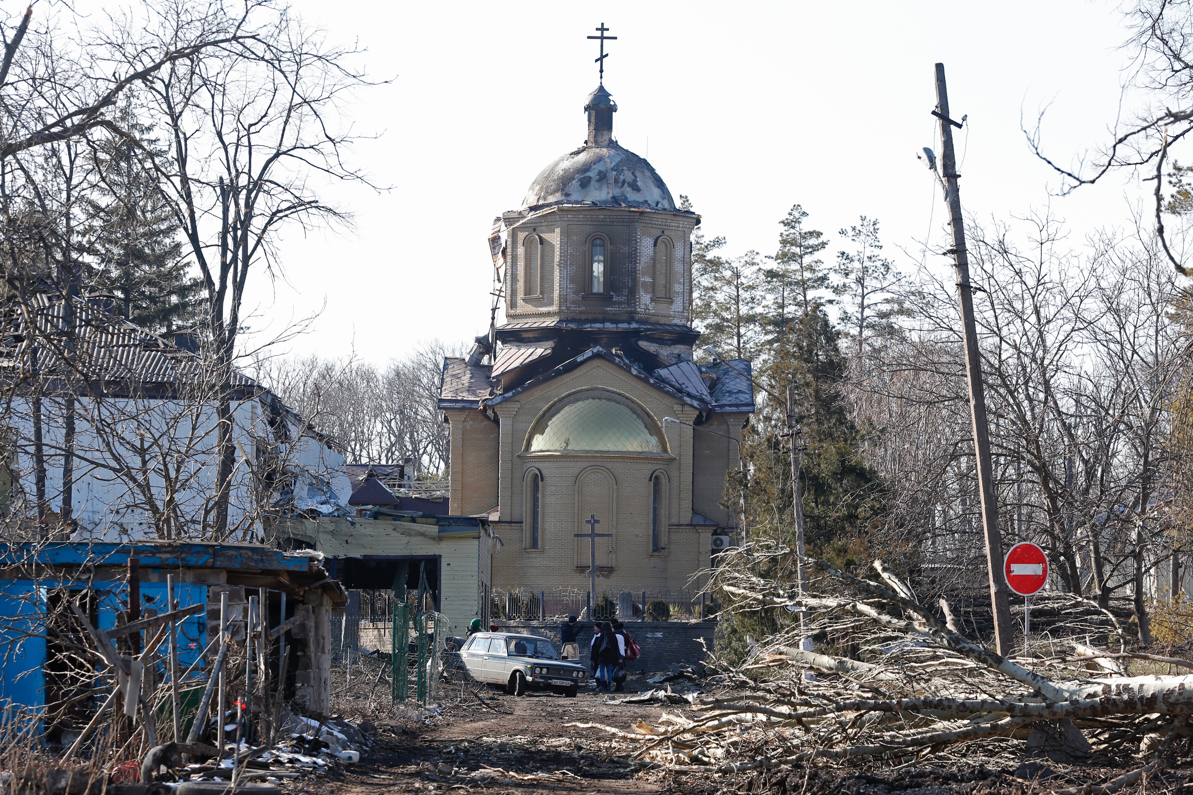 这是2022年3月12日在顿涅茨克的沃尔诺瓦哈拍摄的一座损毁的教堂。(新华社发,维克托摄)
