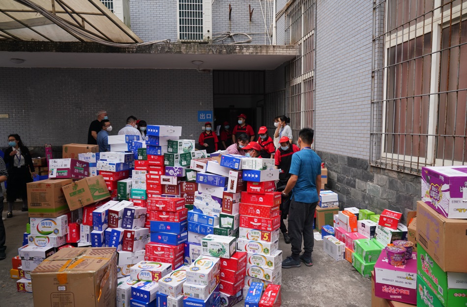 重庆城市管理职业学院志愿者在搬运生活保障物资。(受访者供图)