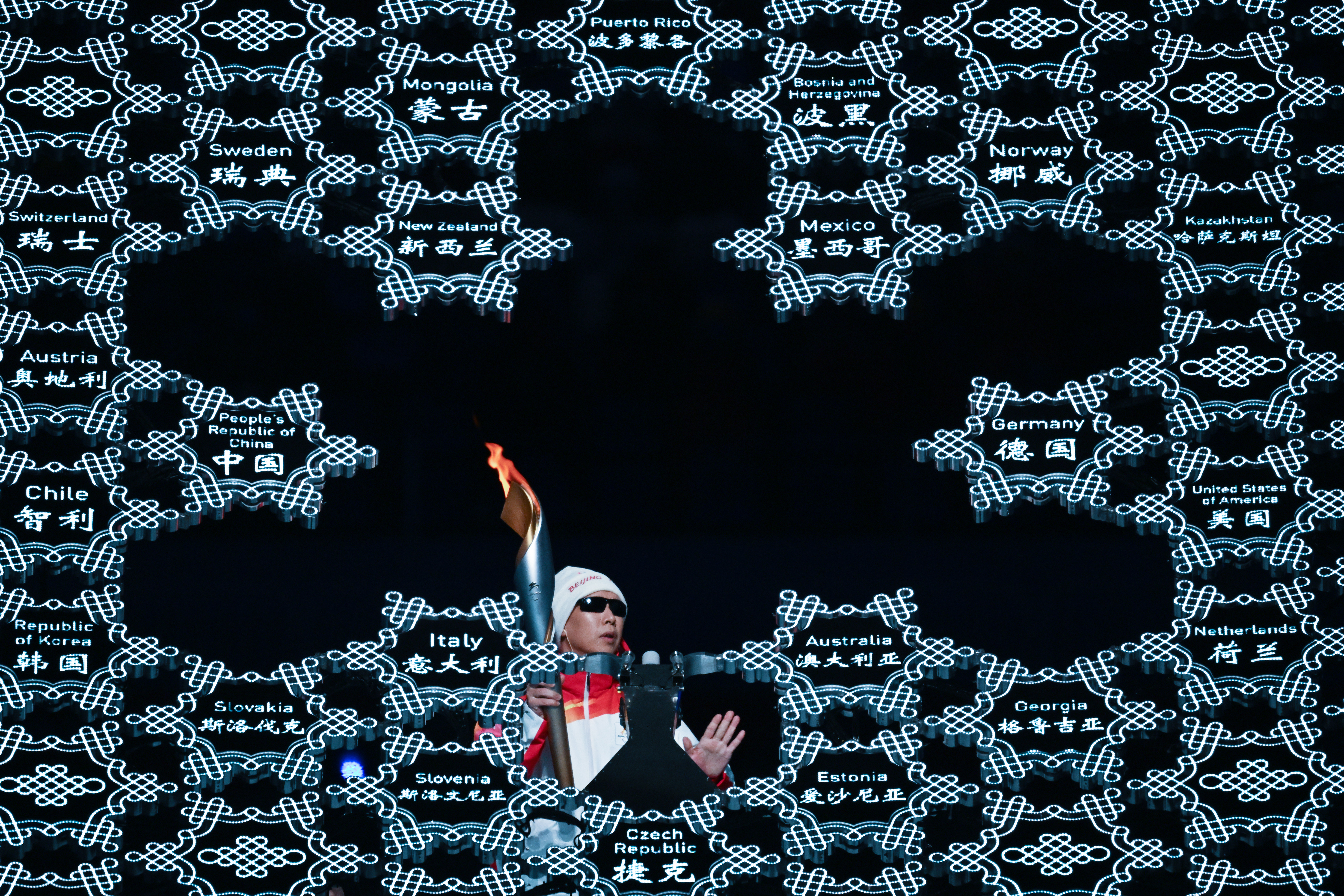 3月4日,最后一棒火炬手李端在北京2022年冬残奥会开幕式上摸索火炬嵌入的位置。新华社记者李尕摄