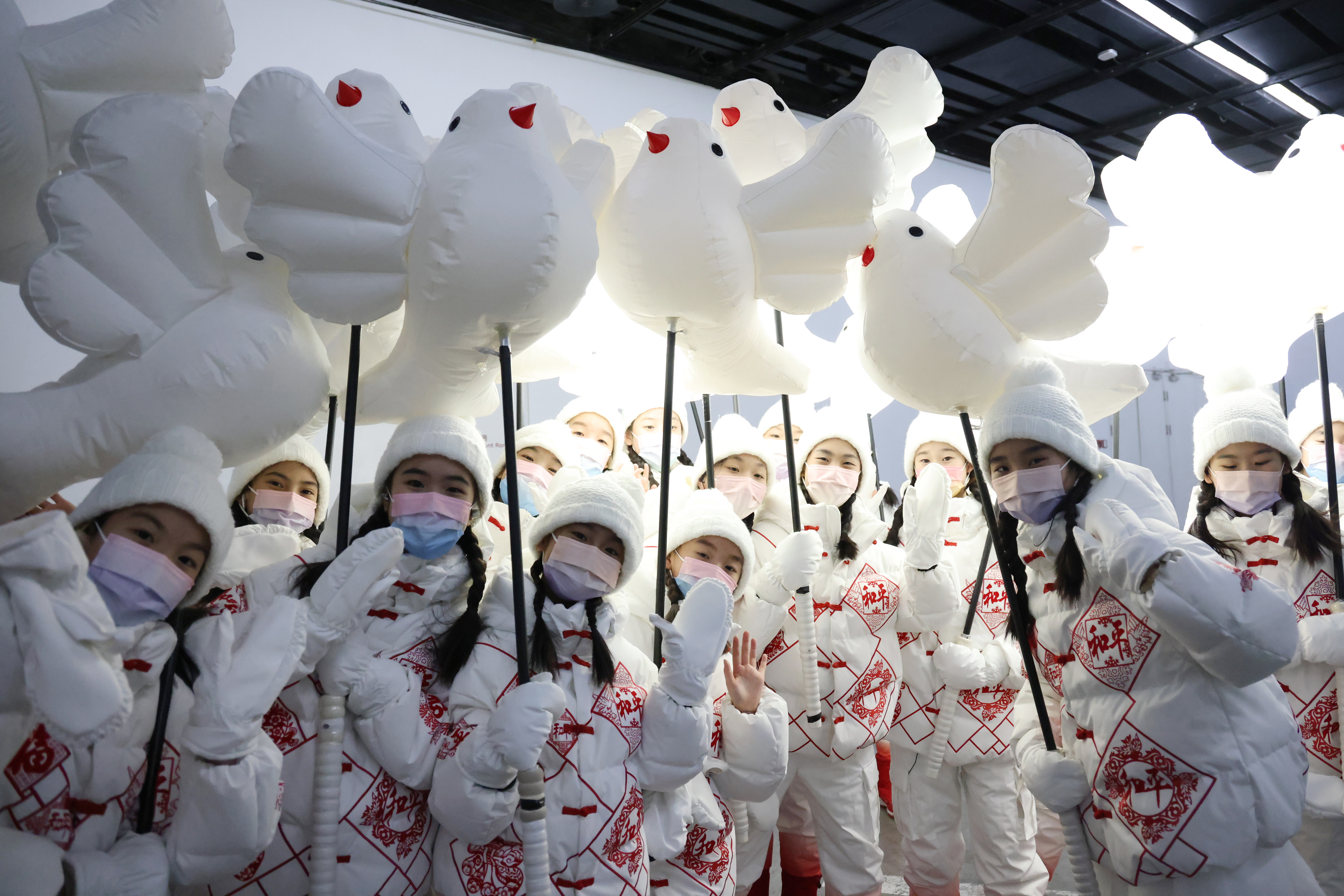 1月27日,北京2022年冬奥会开幕式《雪花》幕后。图为“小鸽子”们在彩排前候场。新华社记者许雅楠摄