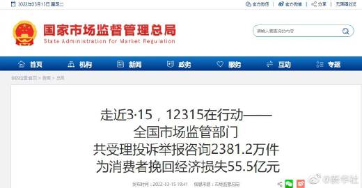 【#去年全国市场监管部门为消费者挽回经济损失55.5亿元#】2021年,全国市场监管部门通过全国12315平台等渠道共受理消费者投诉举报咨询2381.2万件,为消费者挽回经济损失55.5亿元。#全国12315平台调解成功率提高30.9个百分点#,投诉举报处理时长缩短15.41天。(记者赵文君)