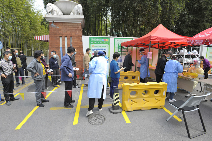 3月13日,上海市明园小安桥小区的居民排队等待接受核酸检测。新华社记者 高峰 摄